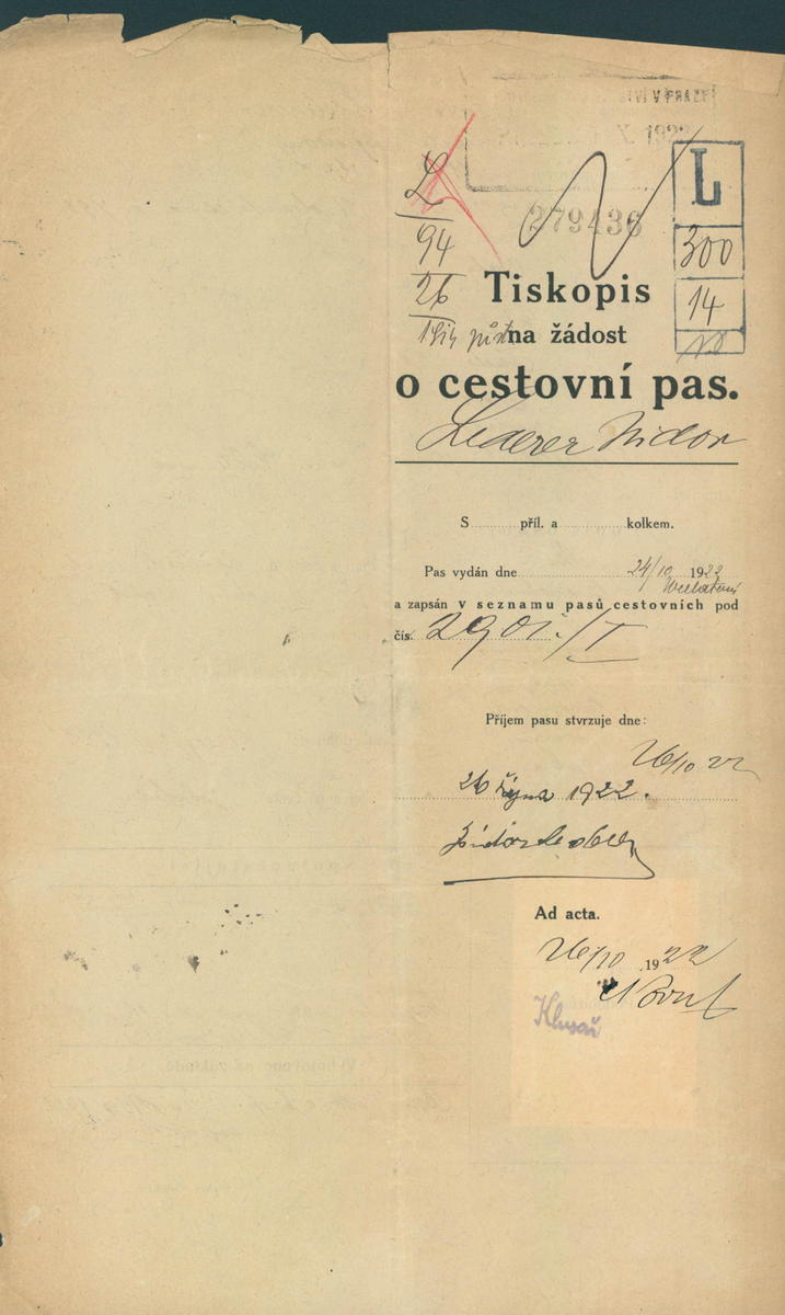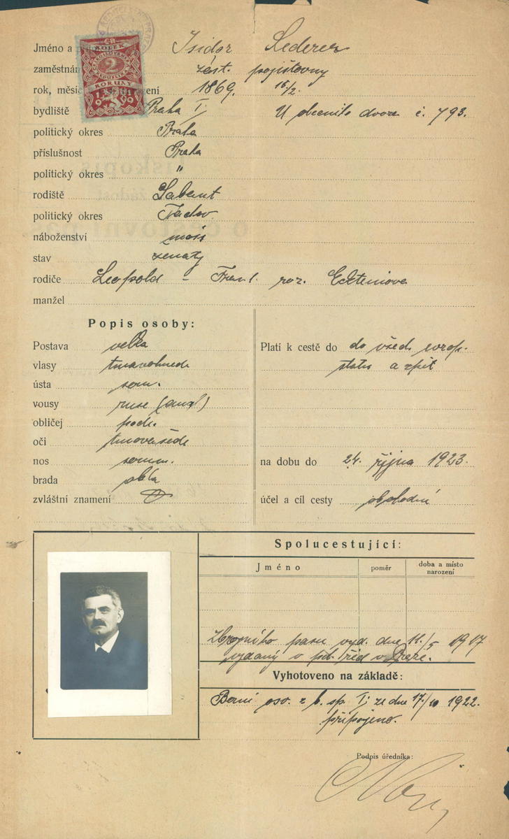 Lederer Isidor: Žádost o vydání cestovního pasu