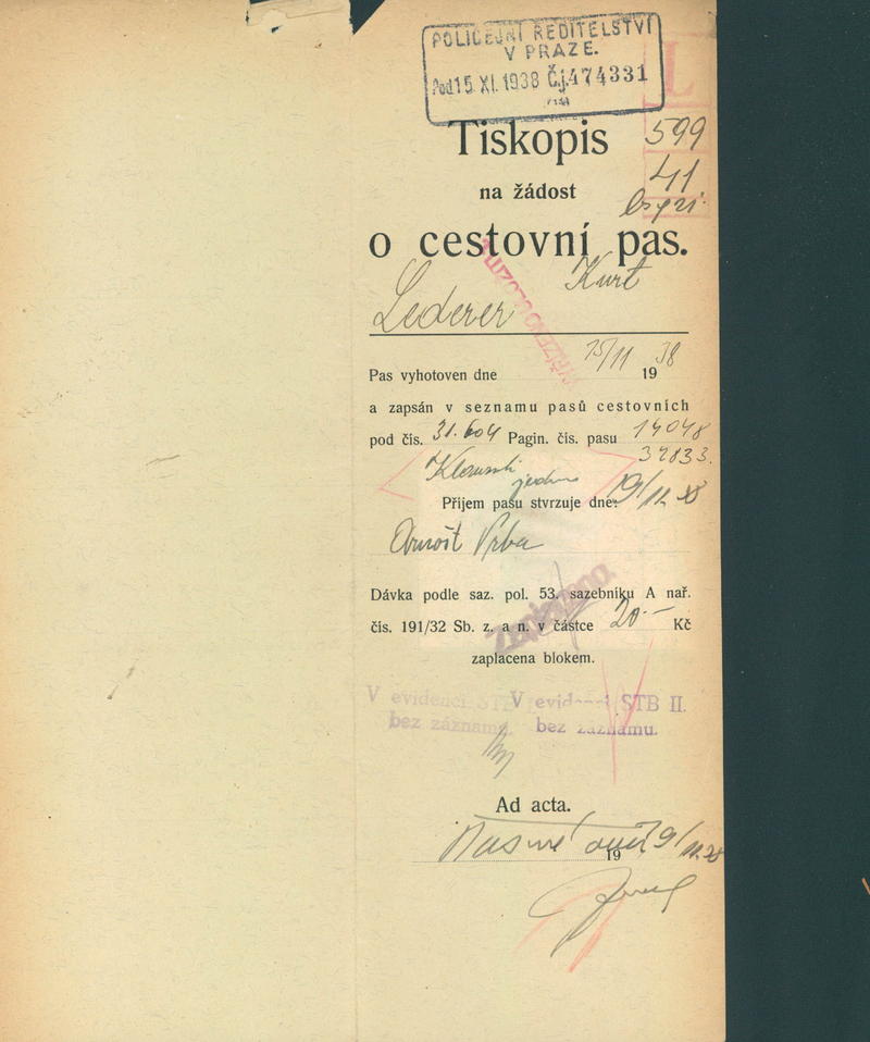 Lederer Kurt: Žádost o vydání cestovního pasu