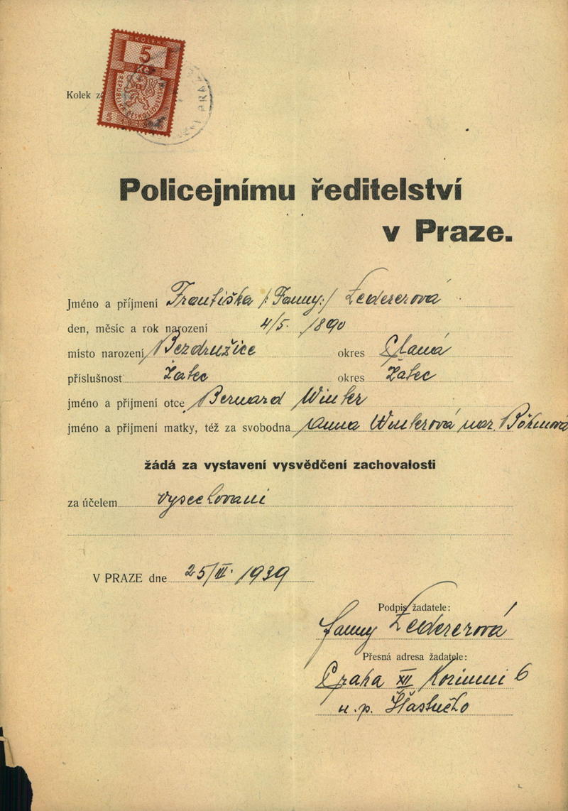 Ledererová Františka: Žádost o vystavení vysvědčení zachovalosti