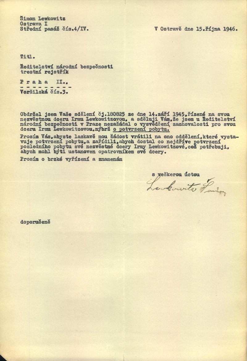 Lewkowitzová Irma: Upřesnění žádosti o potvrzení pobytu