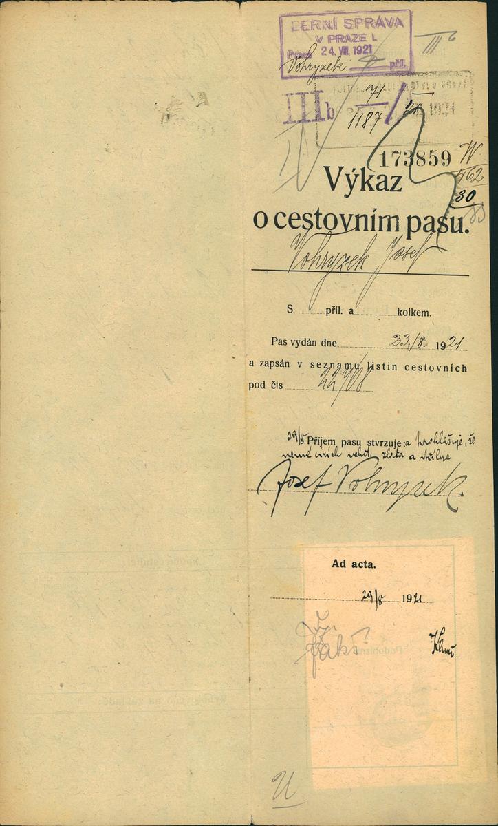 Vohryzek Josef: Žádost o vydání cestovního pasu