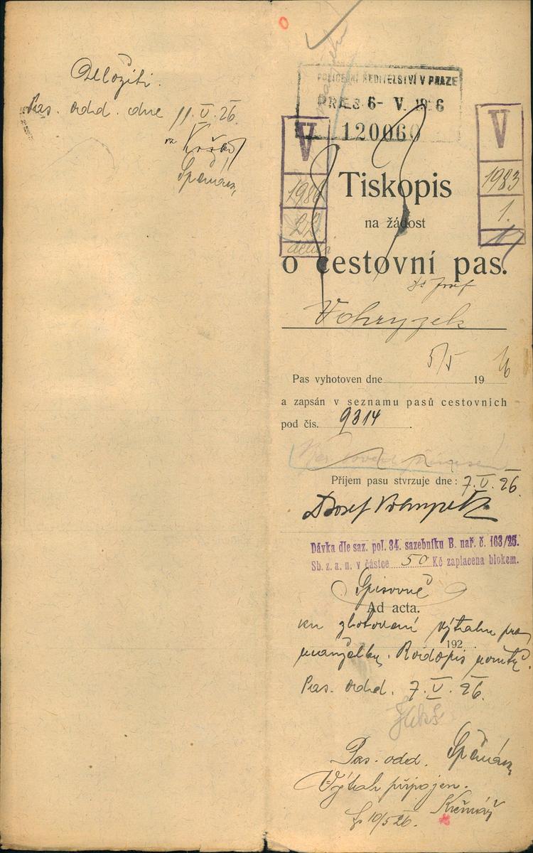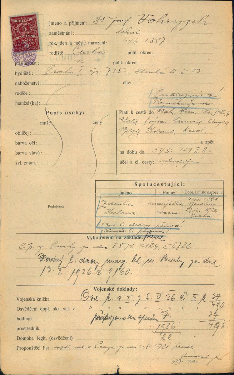 Vohryzek Josef: Žádost o prodloužení a rozšíření cestovního pasu