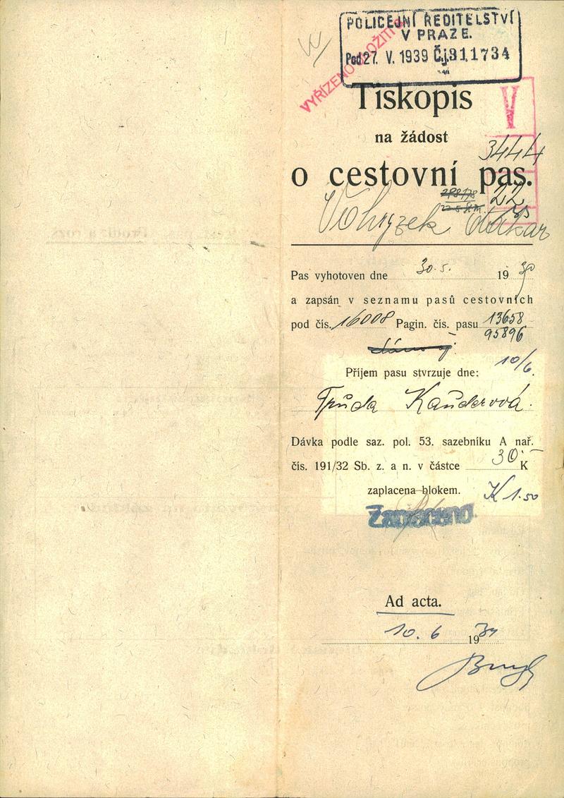 Vohryzek Otto: Žádost o vydání cestovního pasu