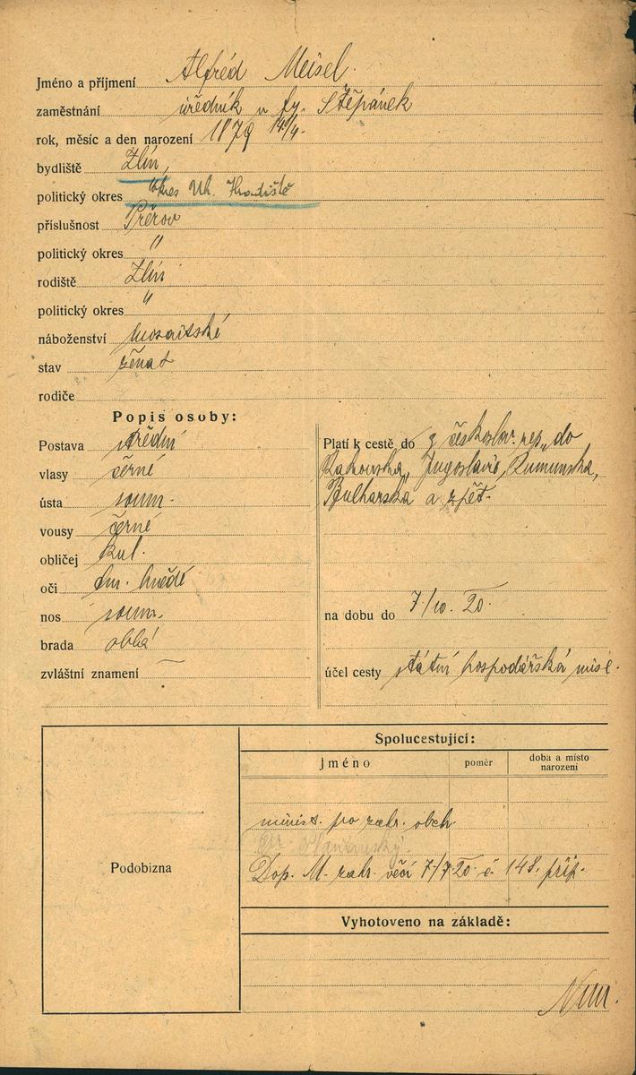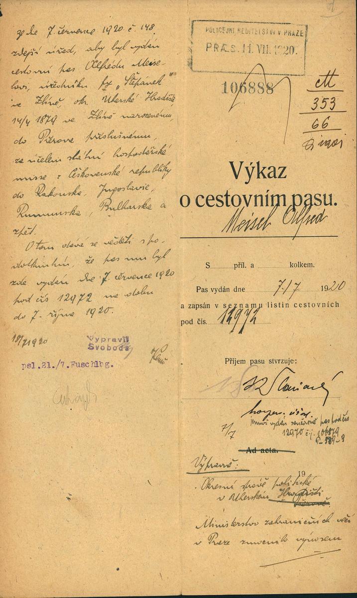 Meisel Alfred: Žádost o vydání cestovního pasu