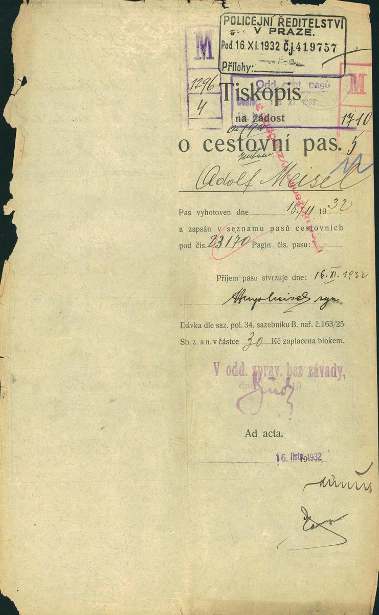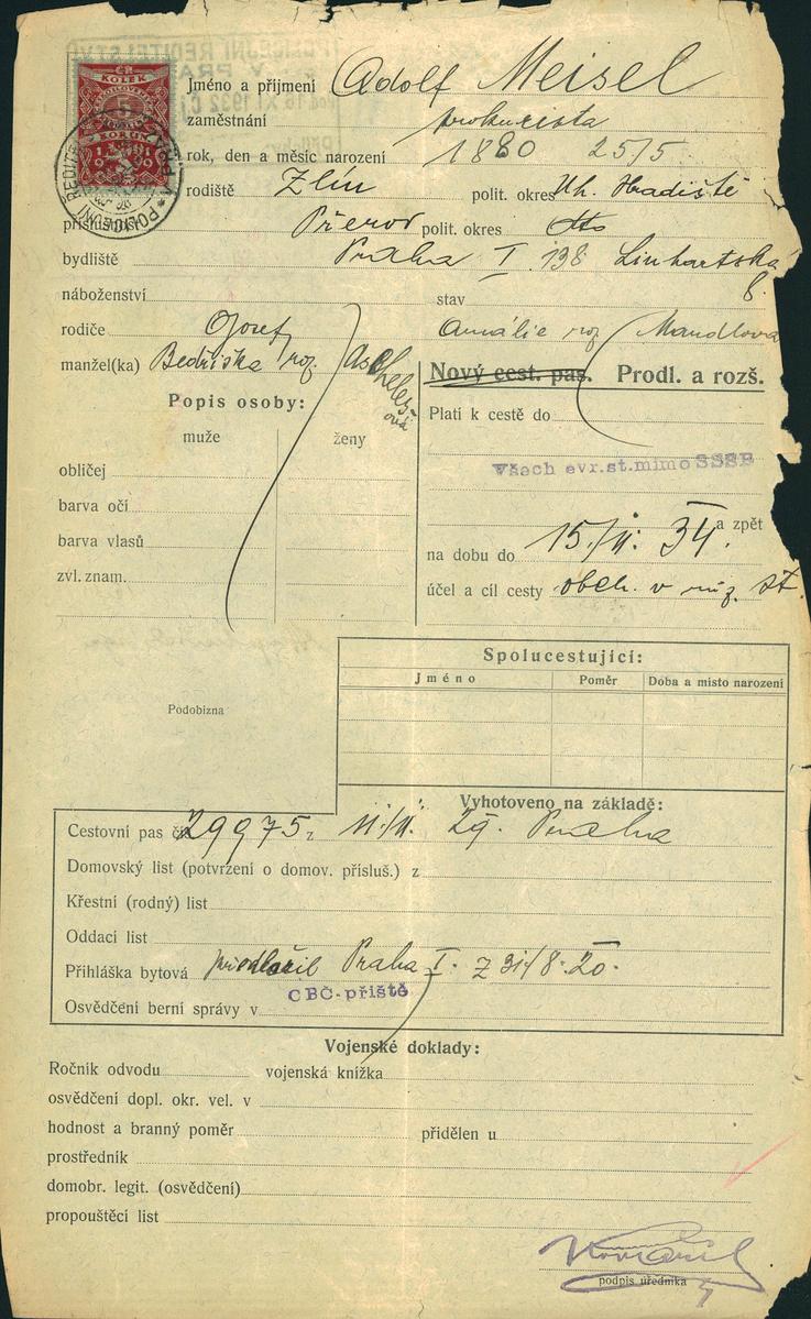 Meisel Adolf: Žádost o prodloužení a rozšíření cestovního pasu