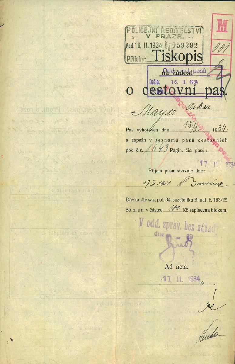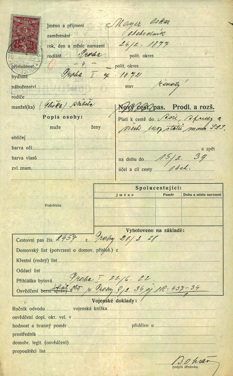 Mayer Oskar: Žádost o prodloužení a rozšíření cestovního pasu