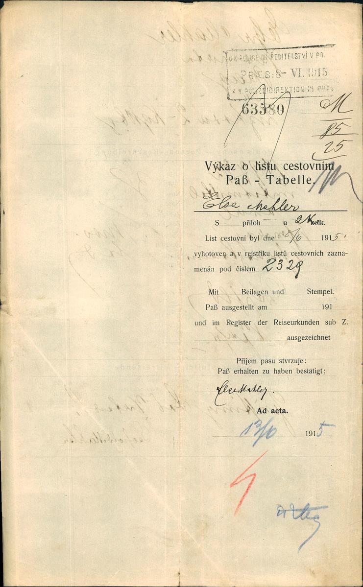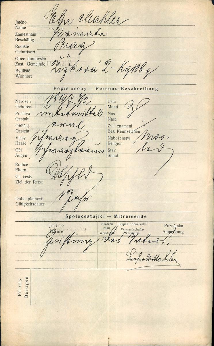Mahlerová Eliška: Žádost o vydání cestovního pasu