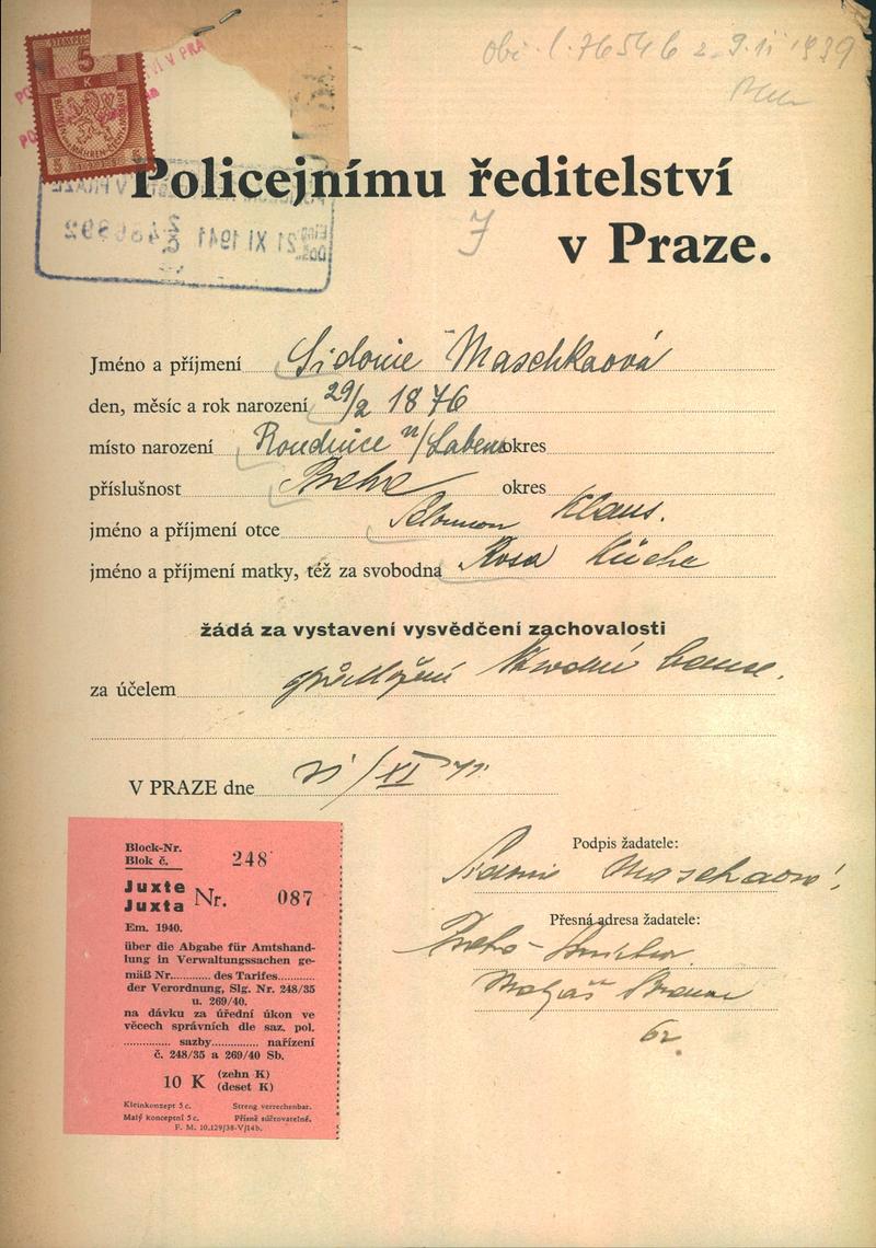Maschková Zdenka: Žádost o vystavení vysvědčení zachovalosti