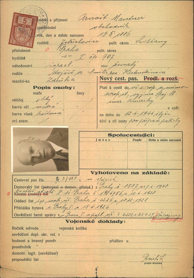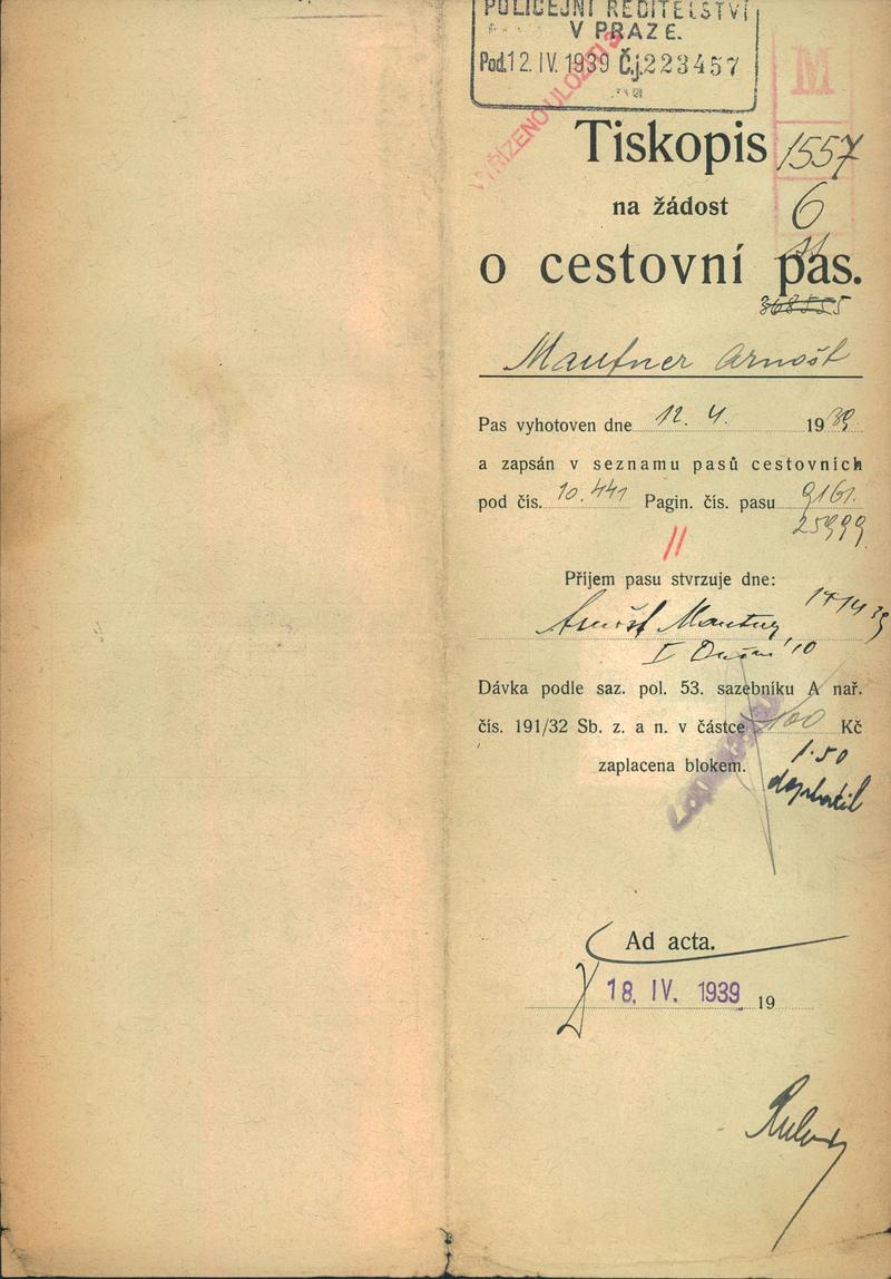Mautner Arnošt: Žádost o vydání cestovního pasu