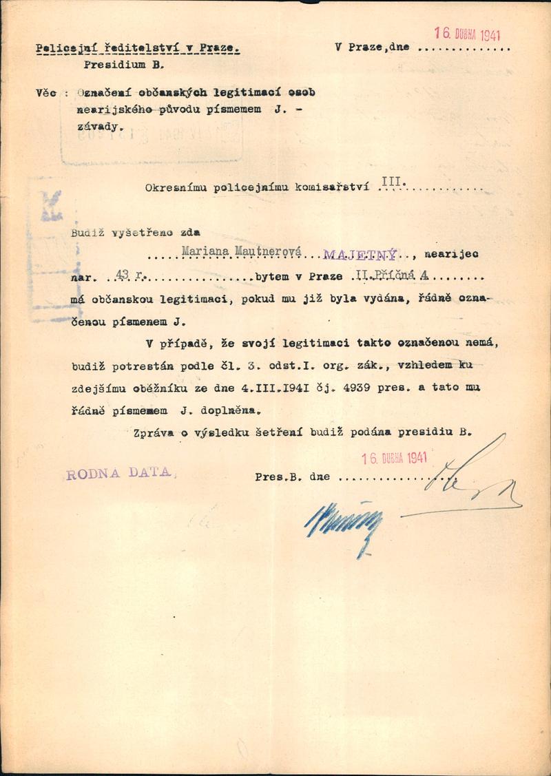 Mautnerová Mariana: Označení občanských legitimací písmenem J