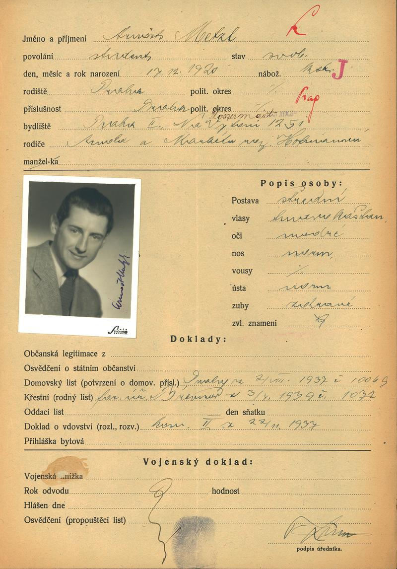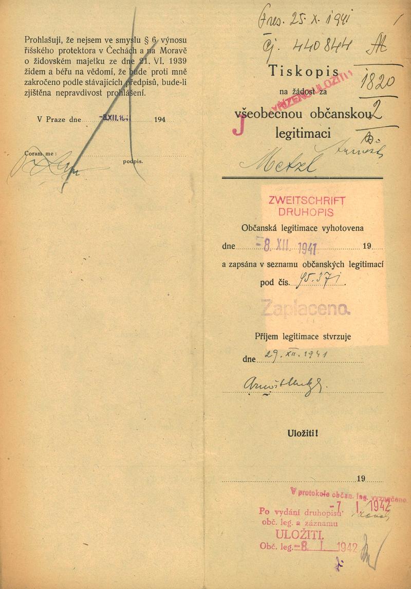 Metzl Arnošt: Žádost o vydání občanské legitimace