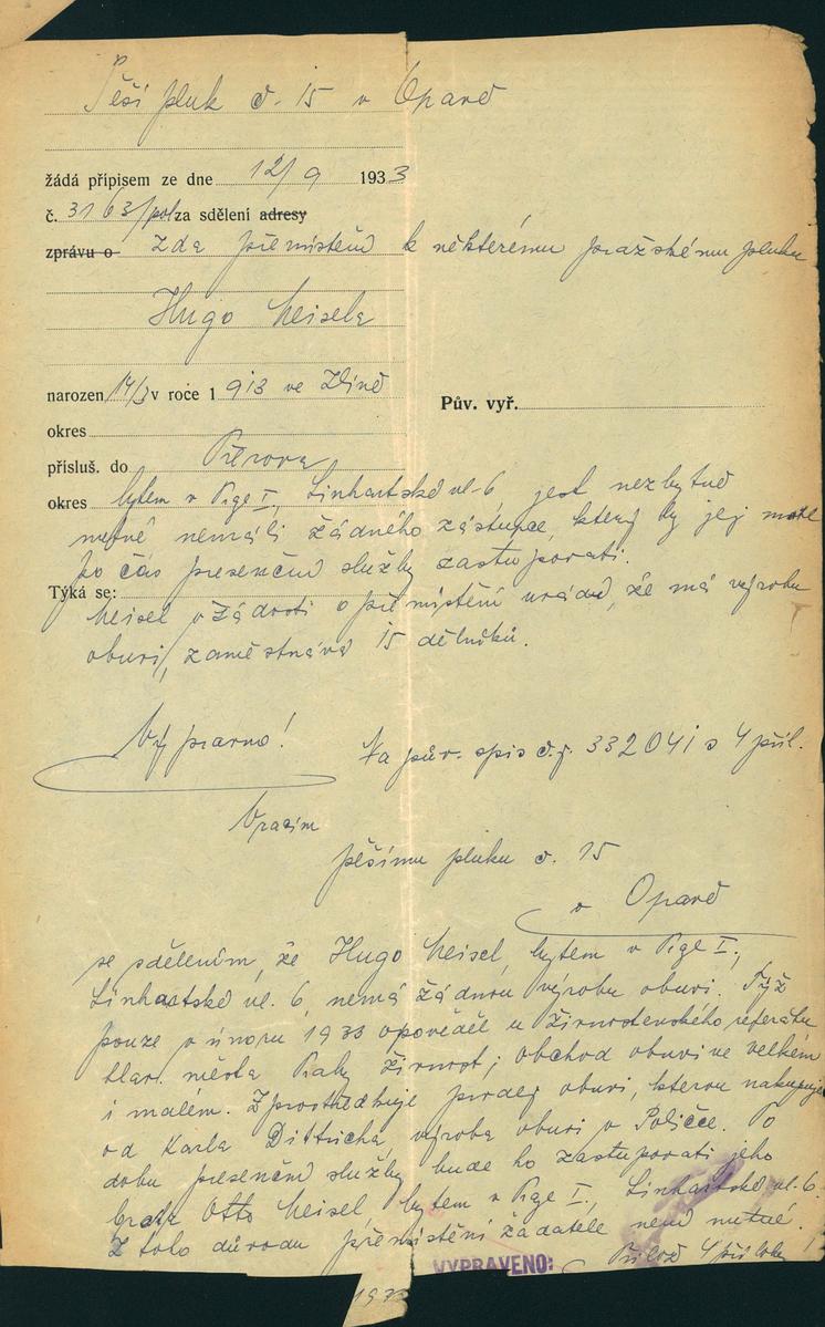 Meisel Hugo: Přemístění k pražskému vojenskému pluku