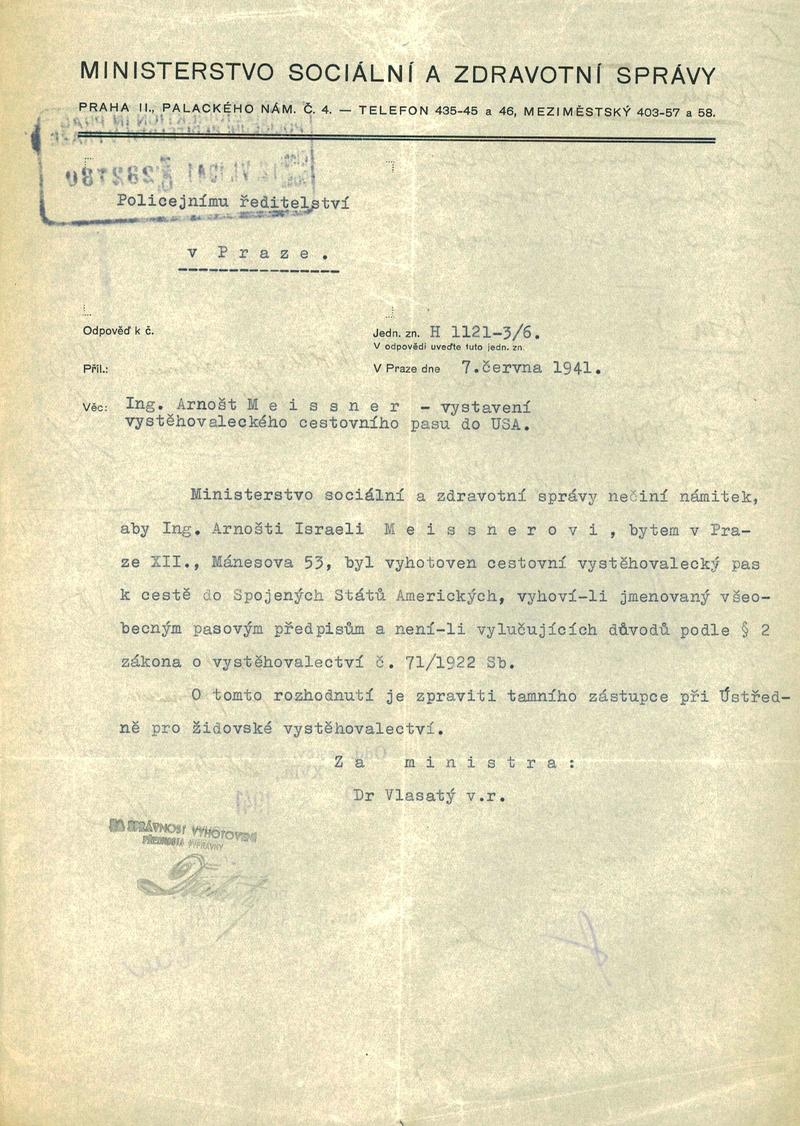 Meissner Arnošt: Souhlas s vydáním vystěhovaleckého cestovního pasu