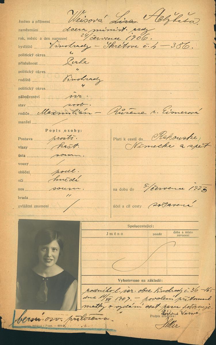Müllerová Líza: Žádost o vydání cestovního pasu