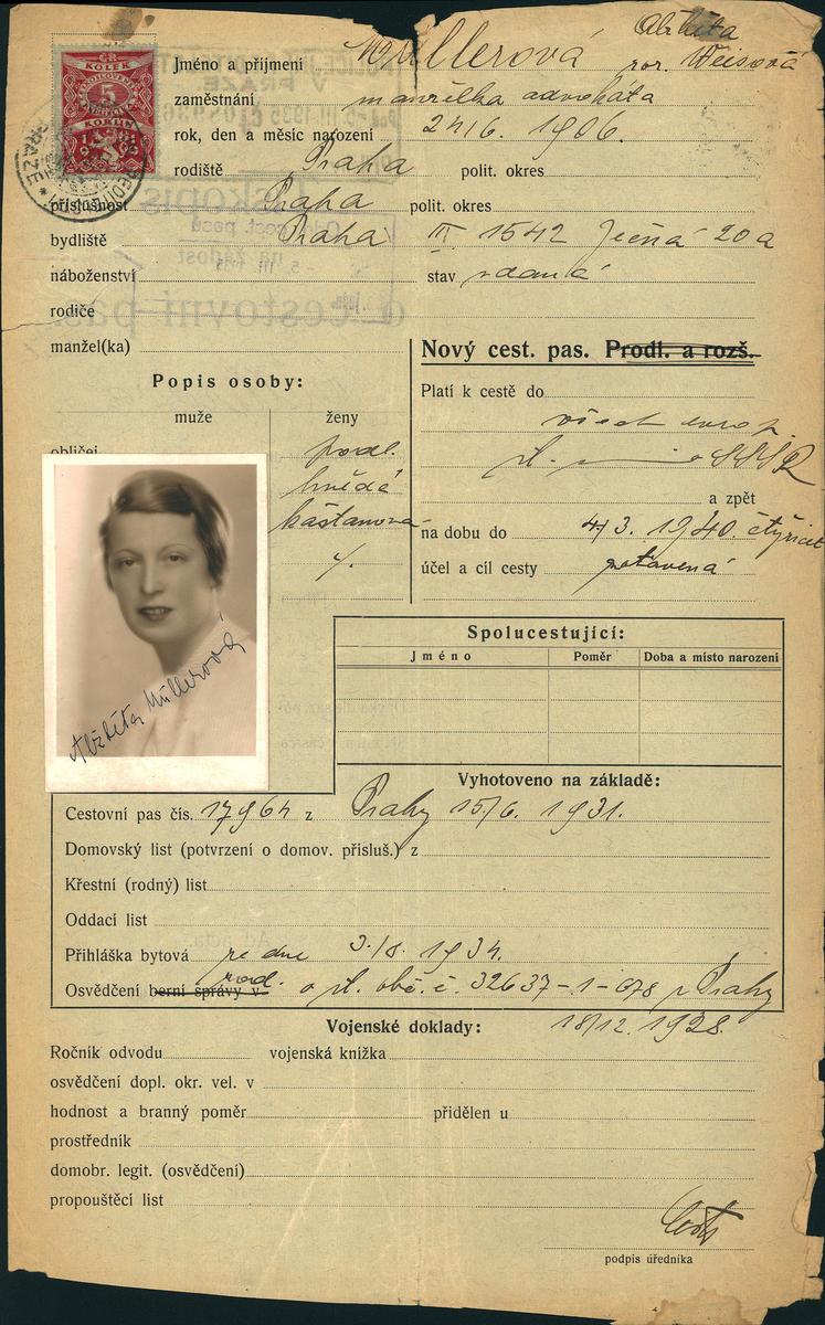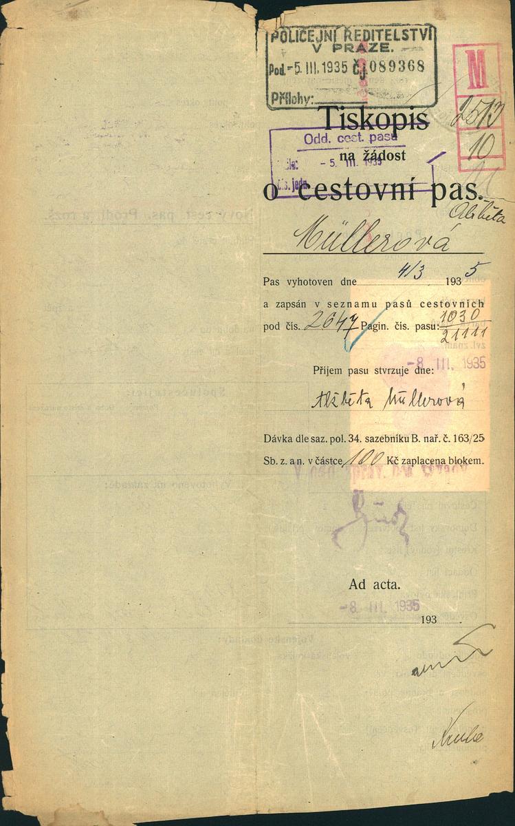 Müllerová Líza: Žádost o vydání cestovního pasu