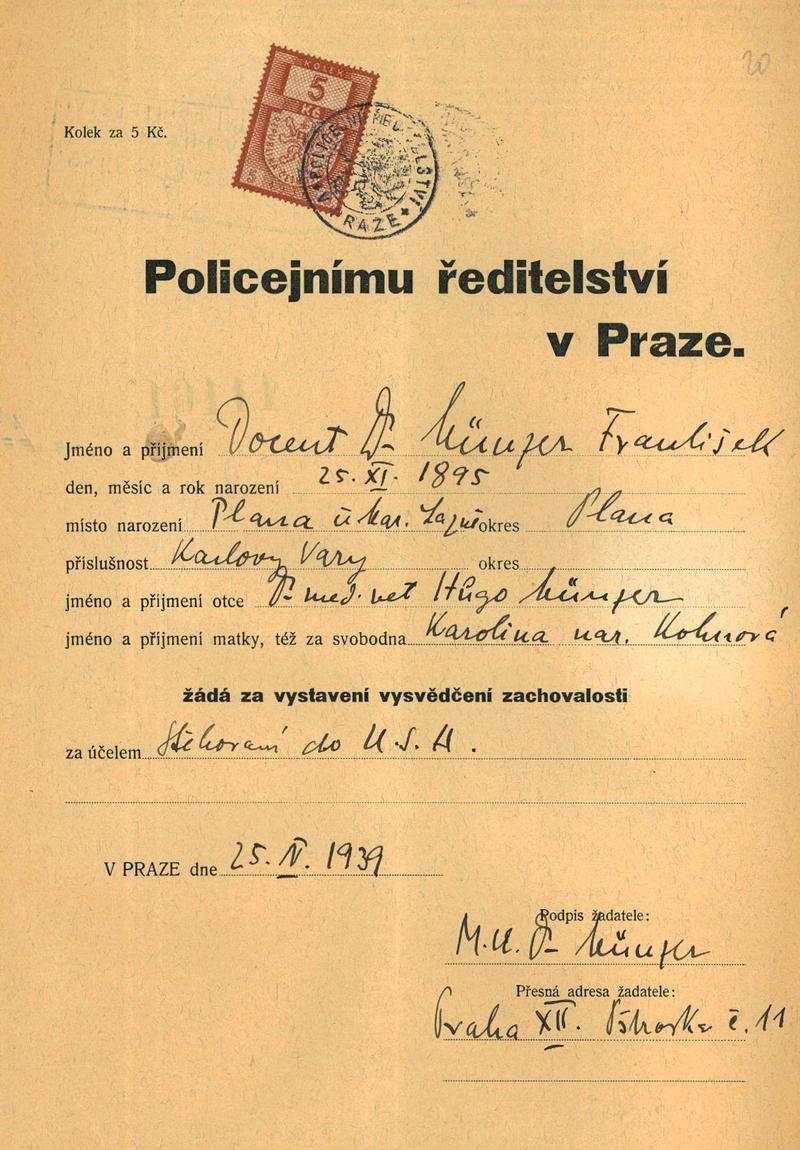 Münzer František: Žádost o vystavení vysvědčení zachovalosti