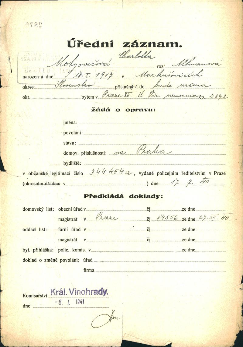 Motyovičová Šarlota: Žádost o opravu v občanské legitimaci