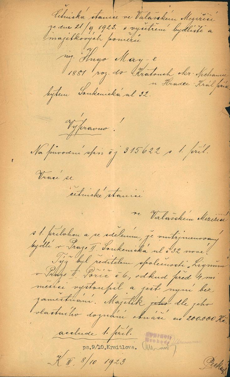 May Hugo: Šetření o pobytu a majetkových poměrech