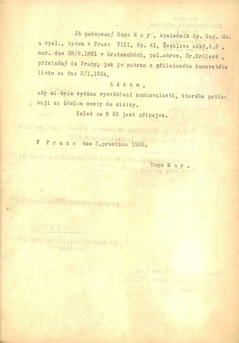 May Hugo: Žádost o vystavení vysvědčení zachovalosti