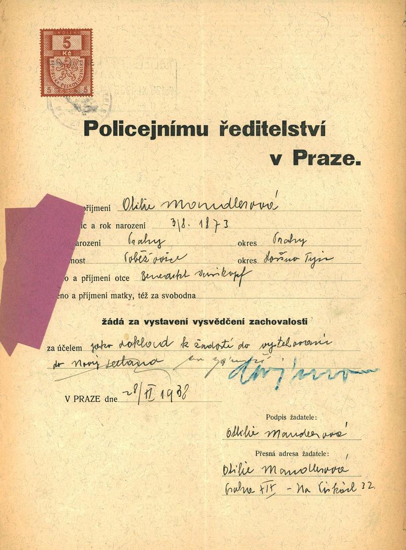 Mandlerová Otilie: Žádost o vystavení vysvědčení zachovalosti