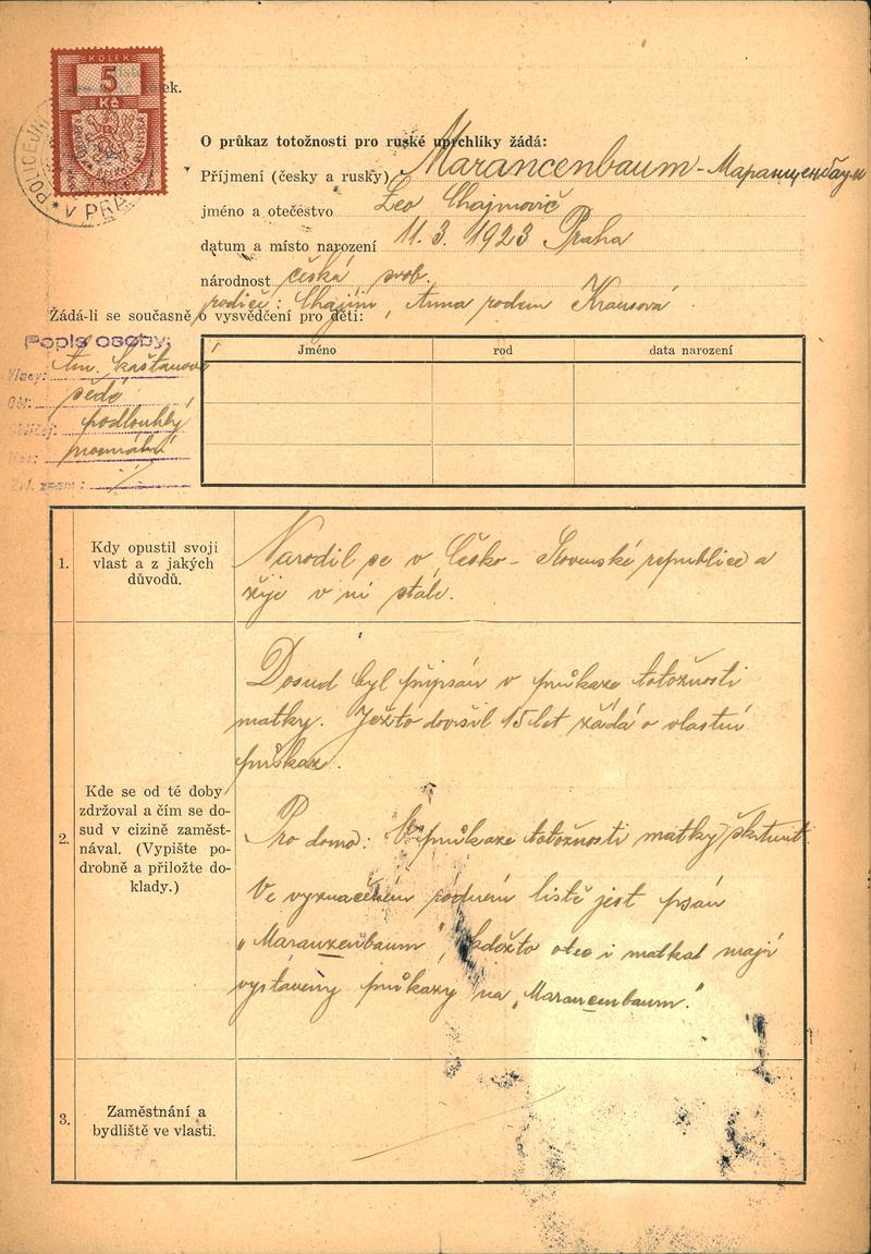 Maranzenbaum Leo: Žádost o vydání průkazu totožnosti pro ruské uprchlíky