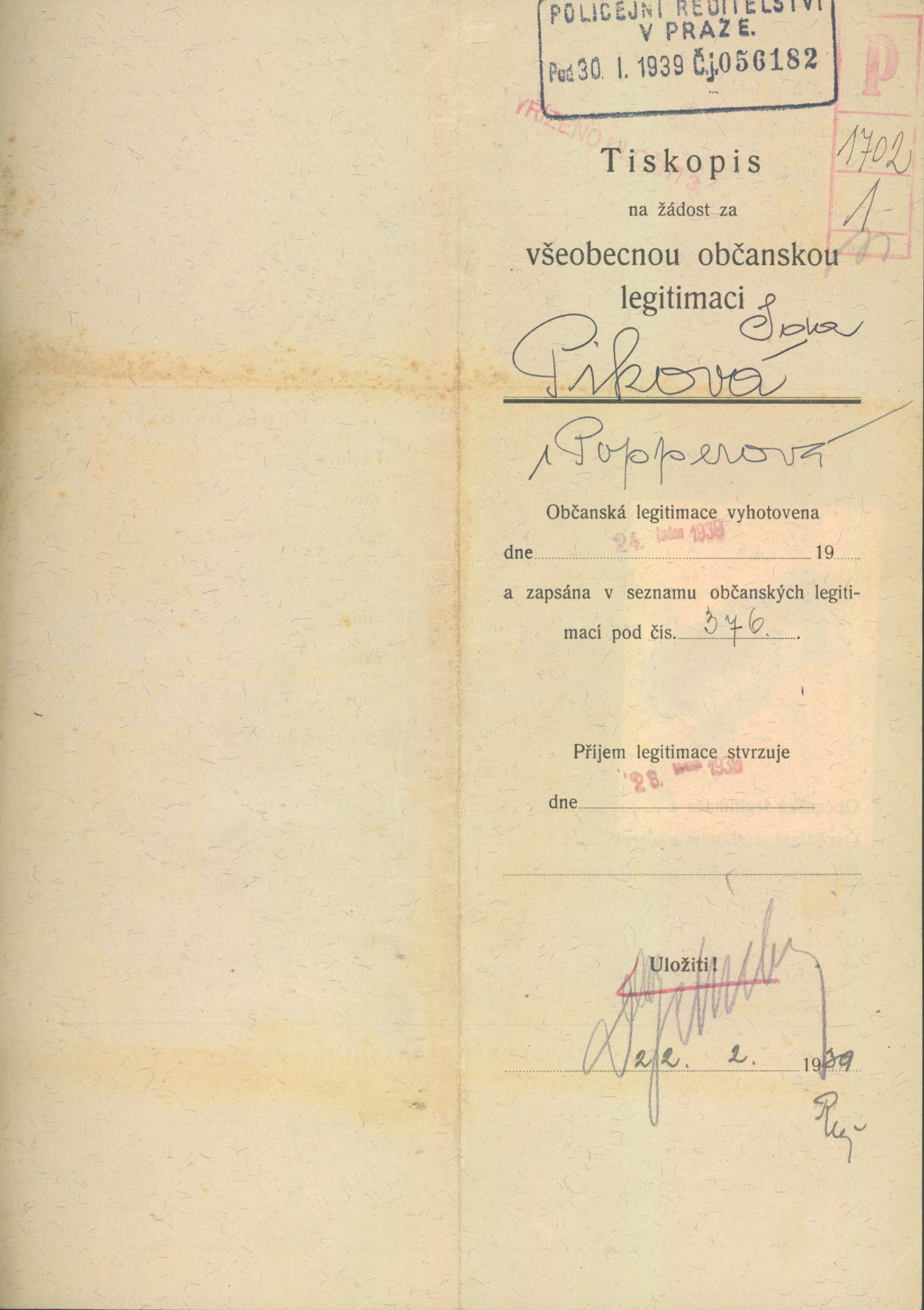 Picková Ida: Žádost o vydání občanské legitimace