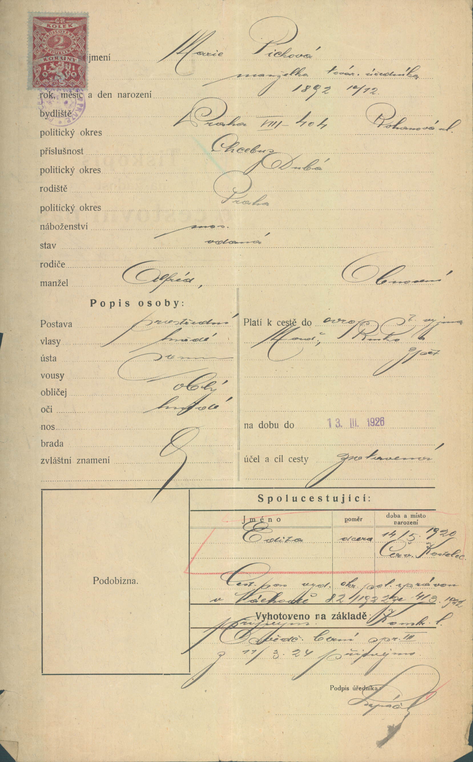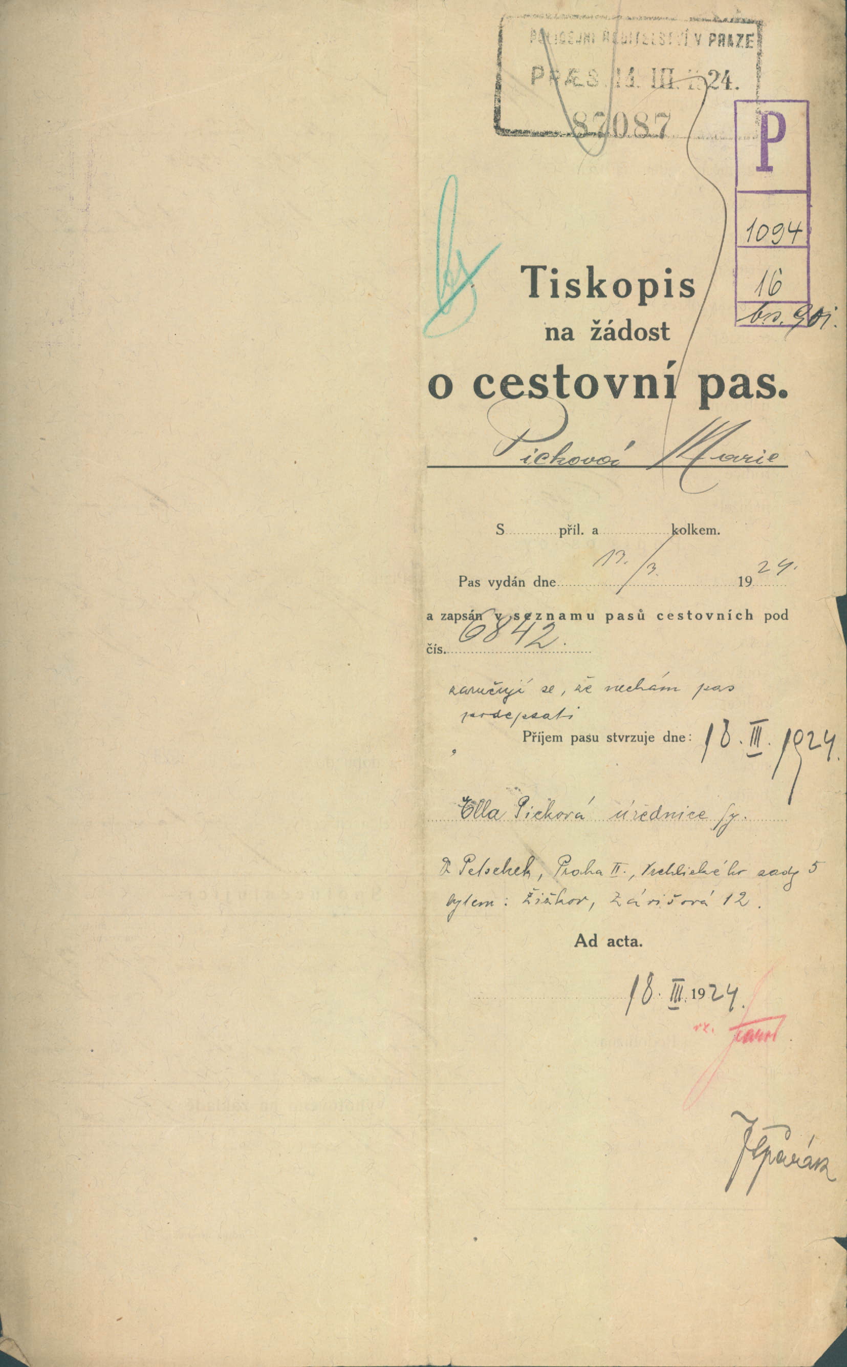 Picková Marie: Žádost o vydání cestovního pasu