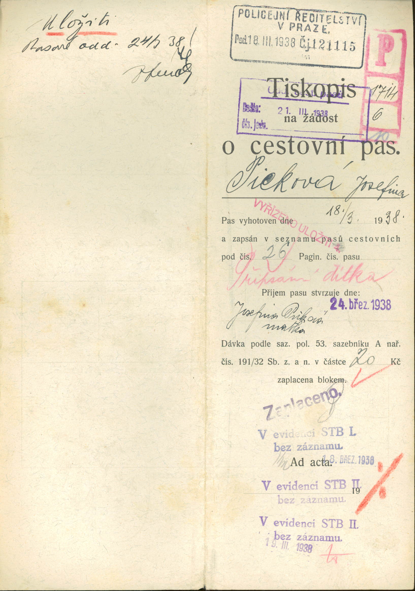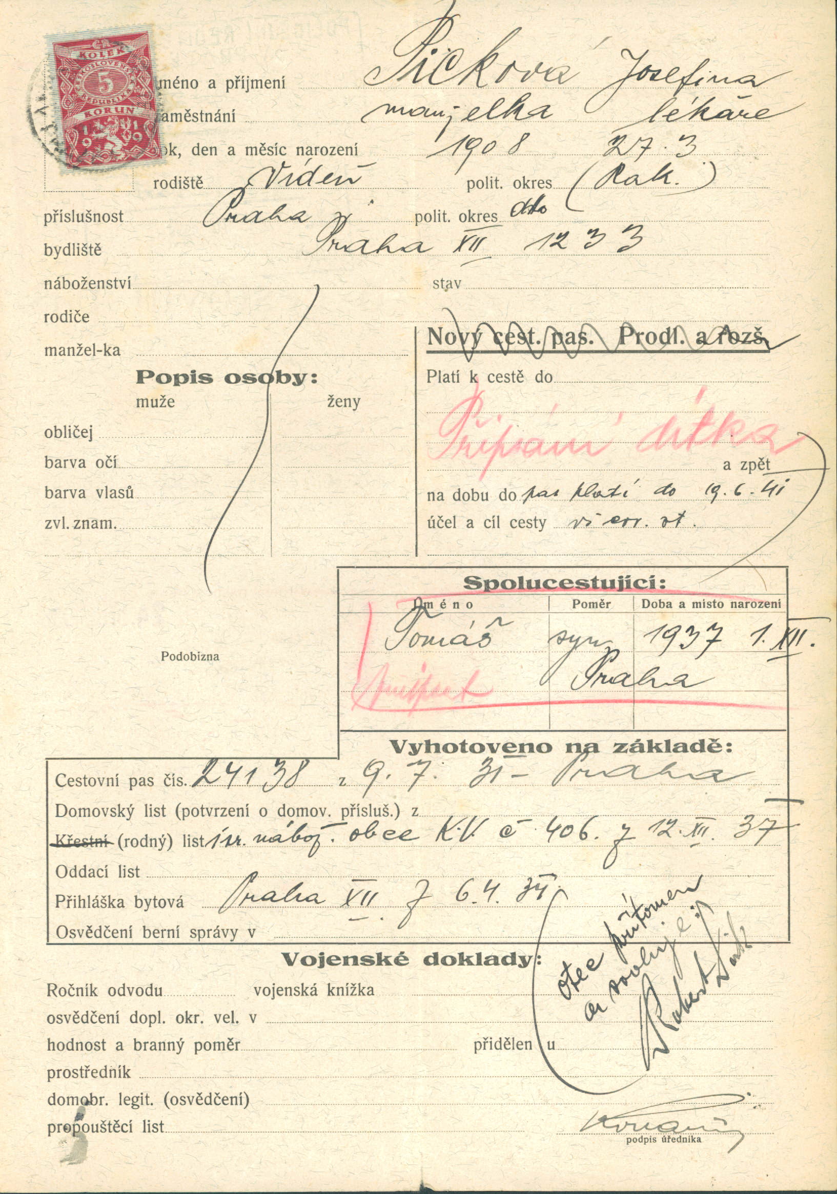 Picková Josefa: Žádost o připsání dítěte do cestovního pasu