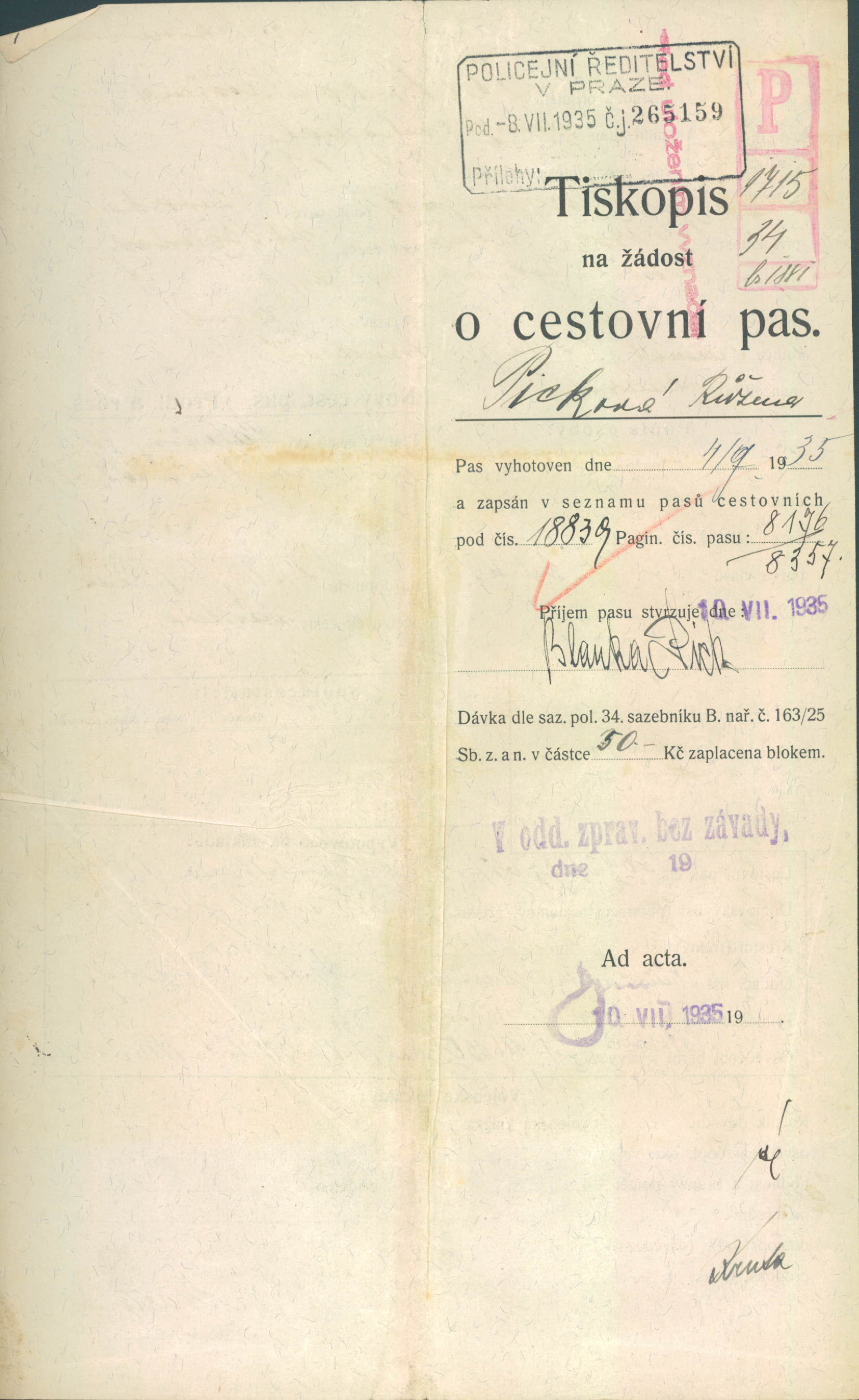 Picková Růžena: Žádost o vydání cestovního pasu