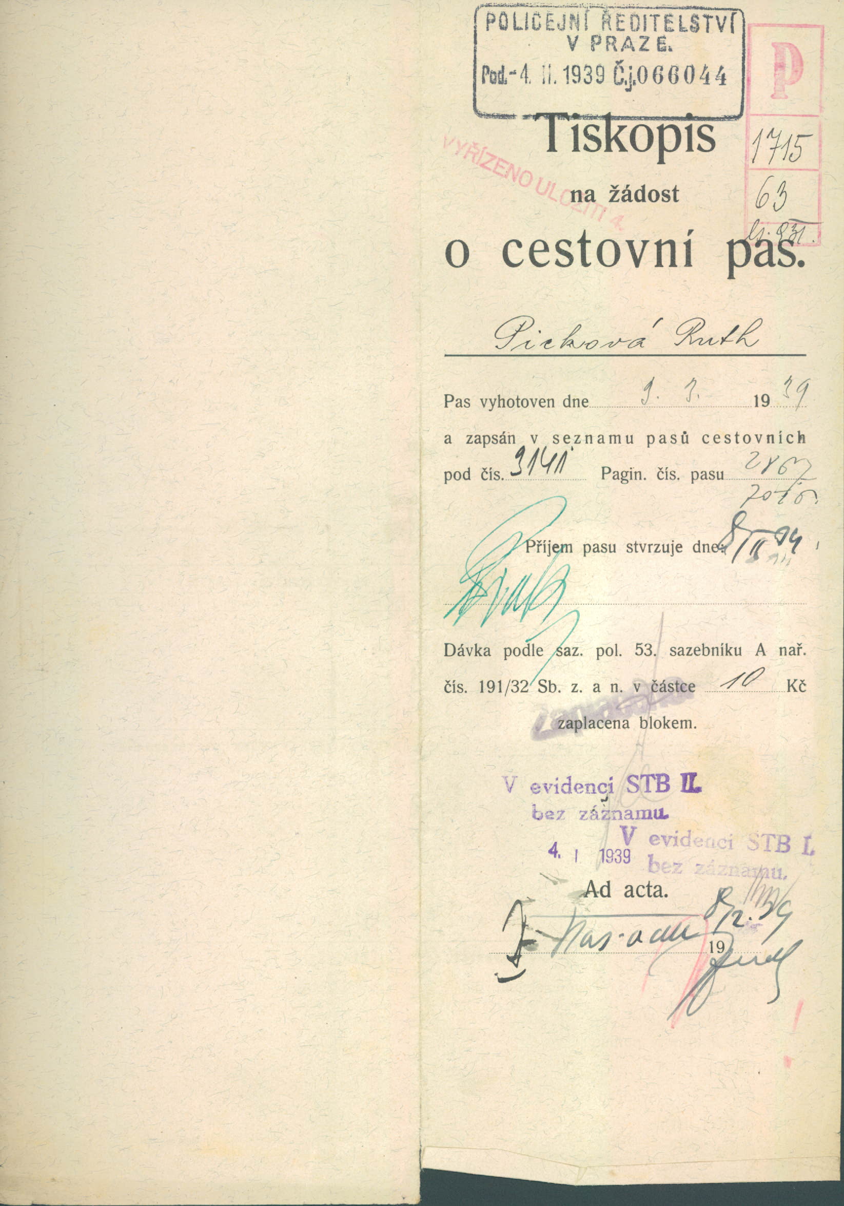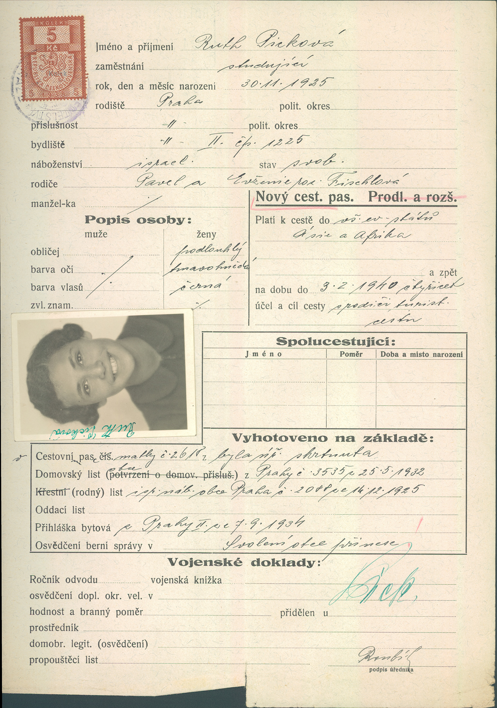 Picková Ruth: Žádost o vydání cestovního pasu
