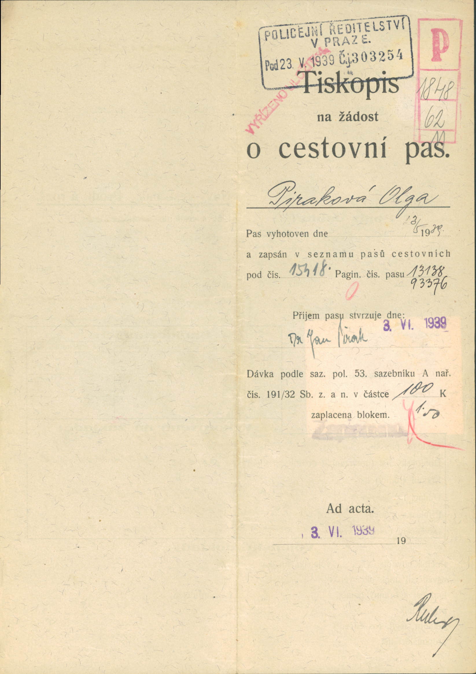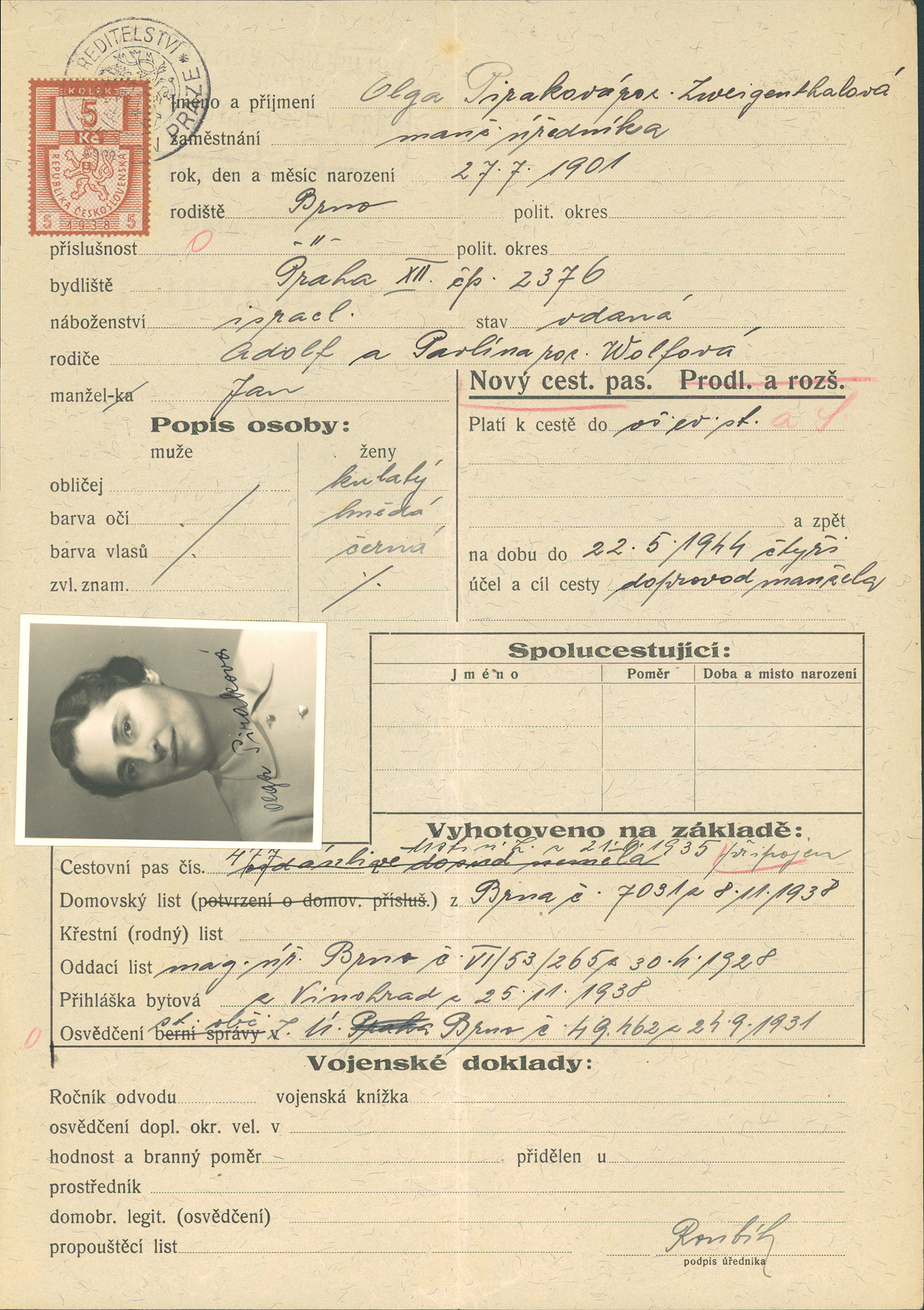 Piraková Olga: Žádost o vydání cestovního pasu