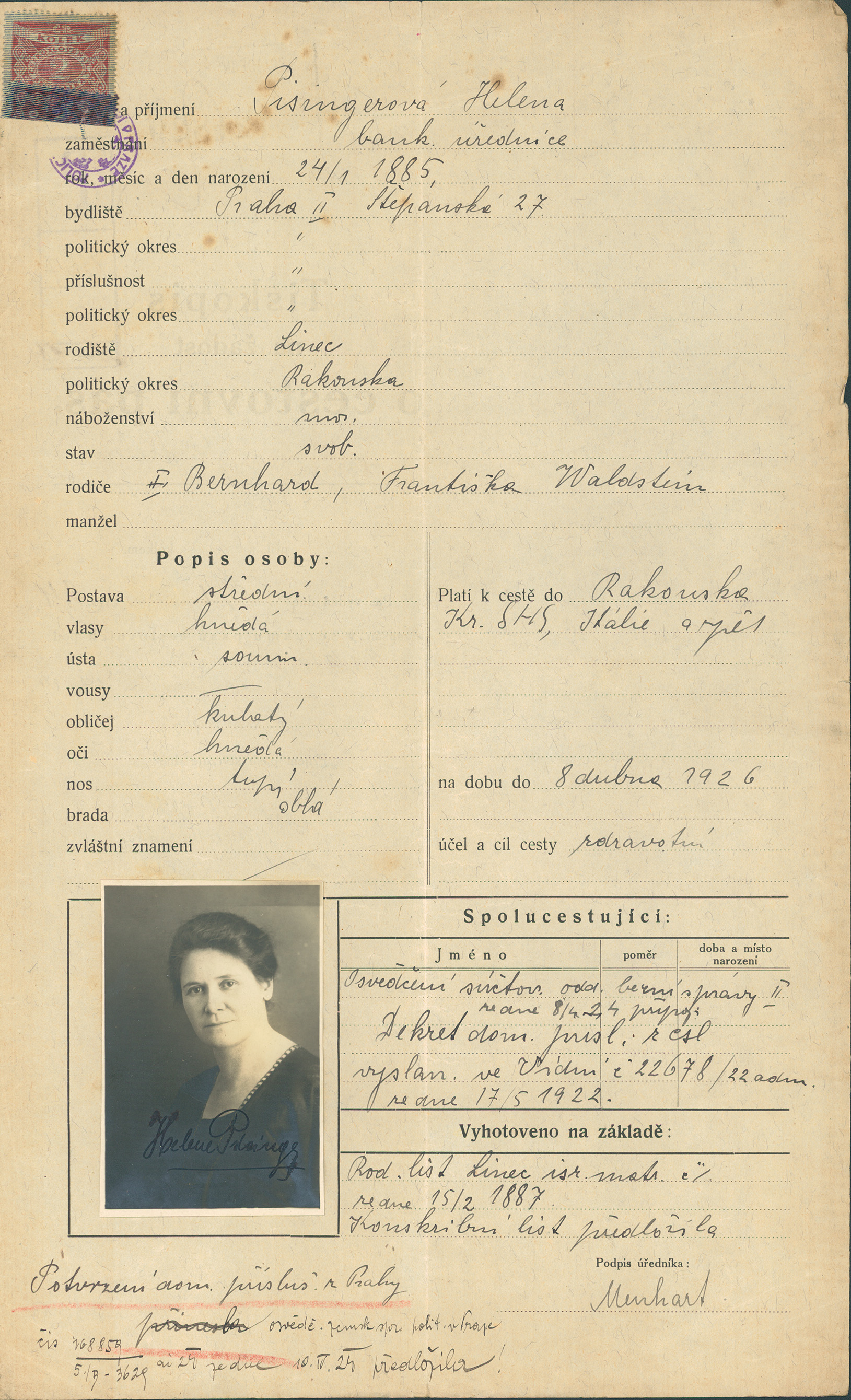 Pisingerová Helena: Žádost o vydání cestovního pasu