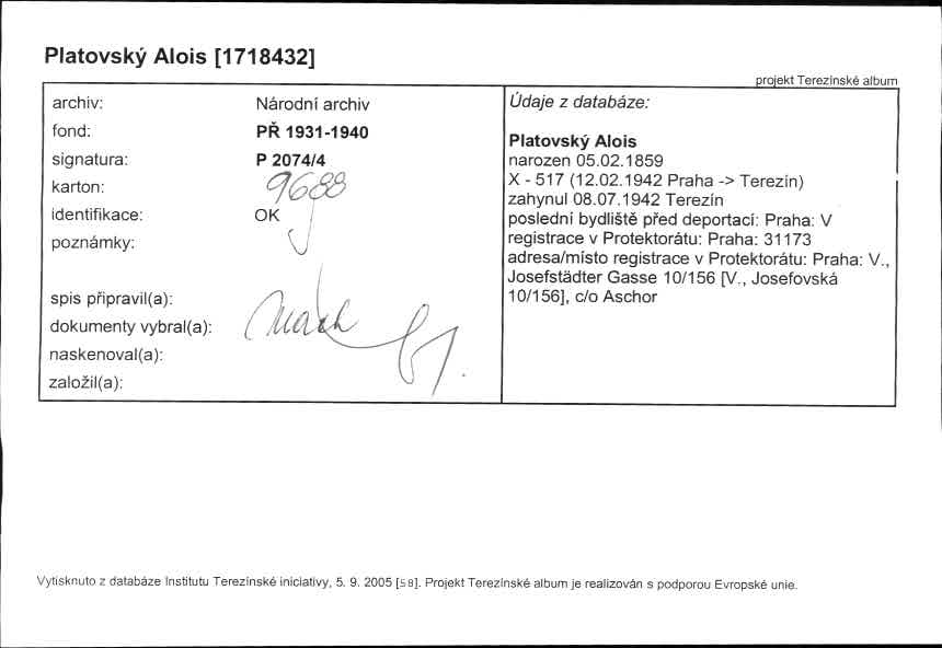 Upozorňujeme, že databáze obsahuje citlivé osobní údaje a jejím účelem je důstojné vzpomínání s respektem vůči pozůstalým. Vstupem do databáze uživatel potvrzuje, že se seznámil s informacemi o jejím obsahu a je si plně vědom své osobní odpovědnosti za nakládání s materiály a informacemi, které v ní nalezne.