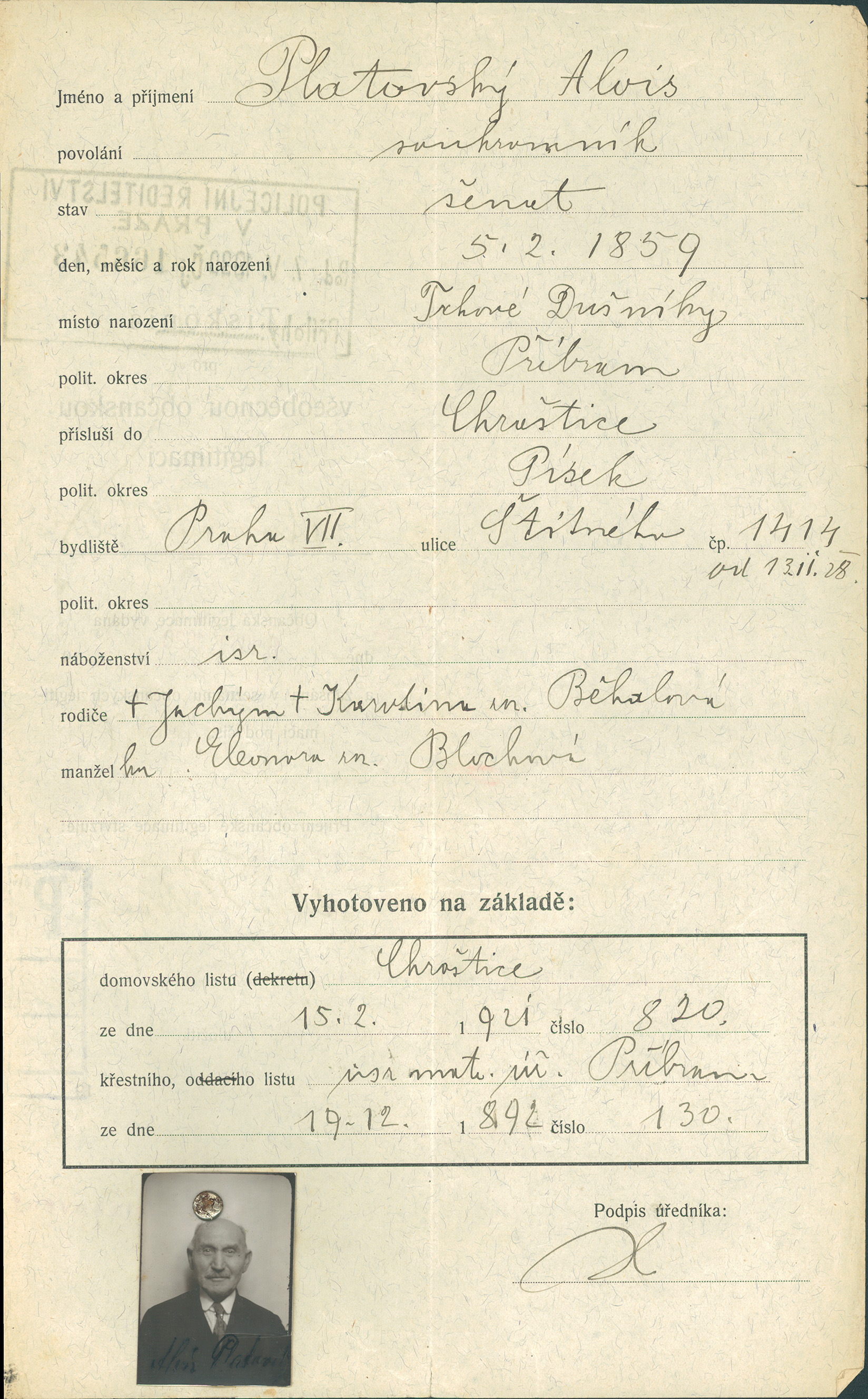 Platovský Alois: Žádost o vydání občanské legitimace