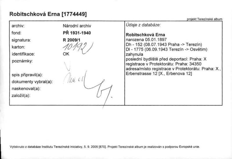 Databáze obětí nacistického pronásledování obsahuje jména a osudy Židů deportovaných z českých zemí a vězňů terezínského ghetta z dalších evropských zemí a dále základní informace o Romech, Sintech a dalších osobách, které zemřely jako vězni v takzvaném „Cikánském táboře I“ v Letech u Písku.
