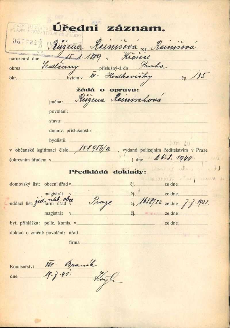 Národní archiv Praha > Policejní ředitelství v Praze > 1941-1950 > R > Reinischová Růžena