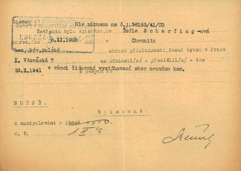 Národní archiv Praha > Policejní ředitelství v Praze > 1941-1950 > S > Scharfingová Sophie