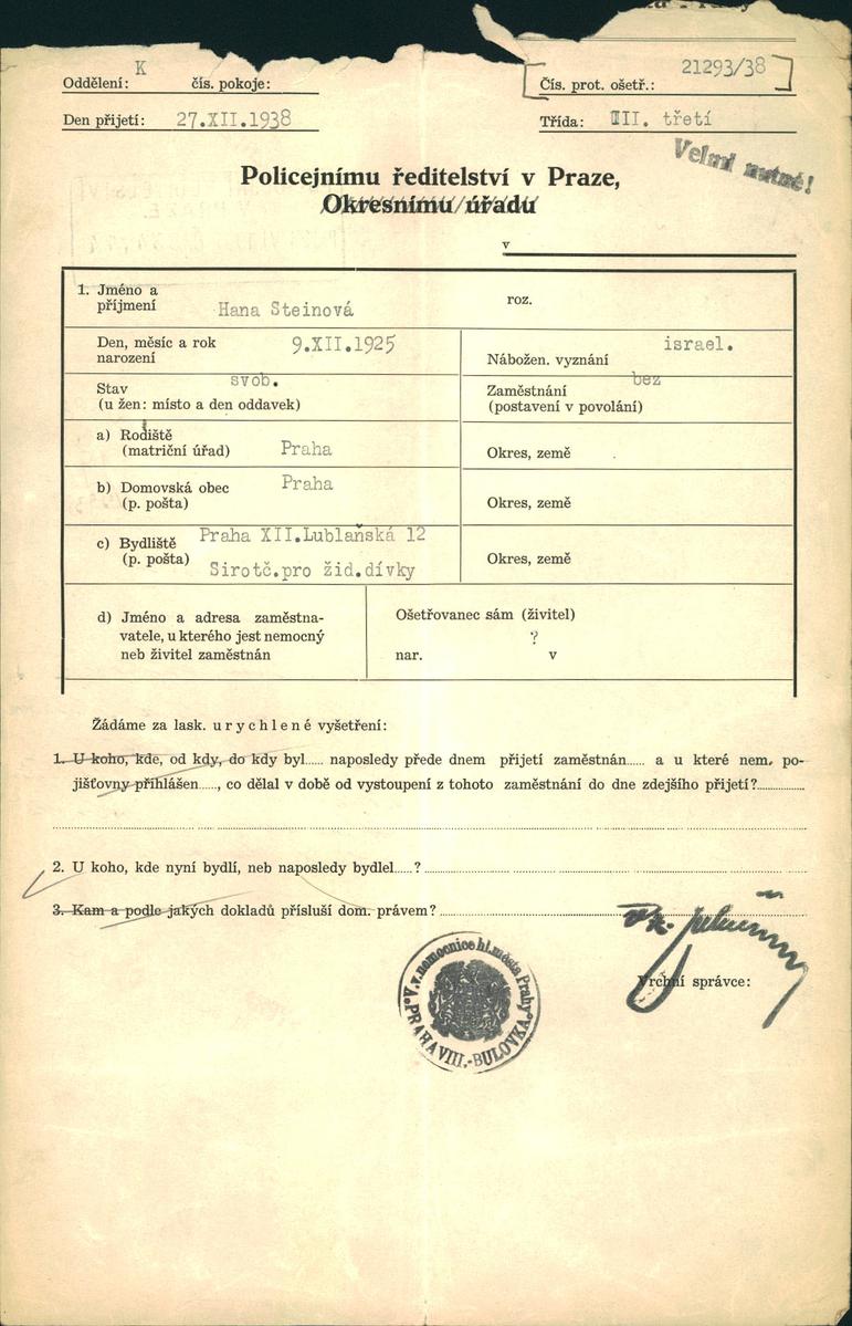Národní archiv Praha > Policejní ředitelství v Praze > 1941-1950 > S > Steinová Hana