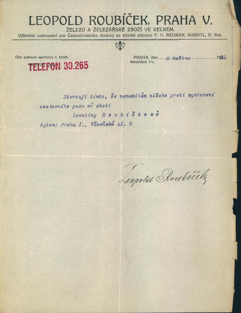 Národní archiv Praha > Policejní ředitelství v Praze > 1921-1930 > R > Roubičková Leontina