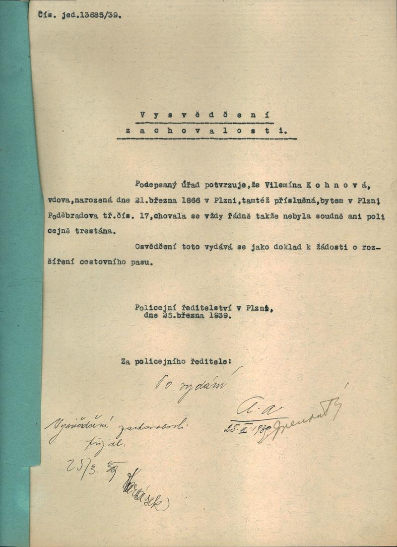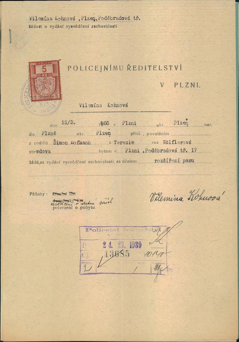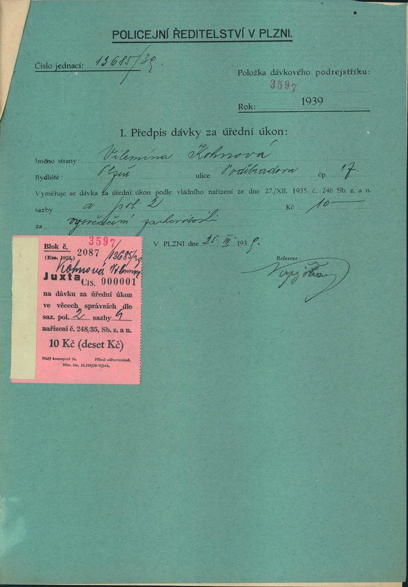 Státní oblastní archiv v Plzni > Policejní ředitelství Plzeň > 1918-1951 > K > Kohnová Vilemina