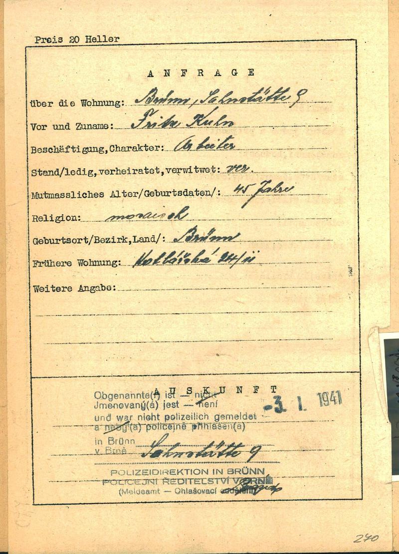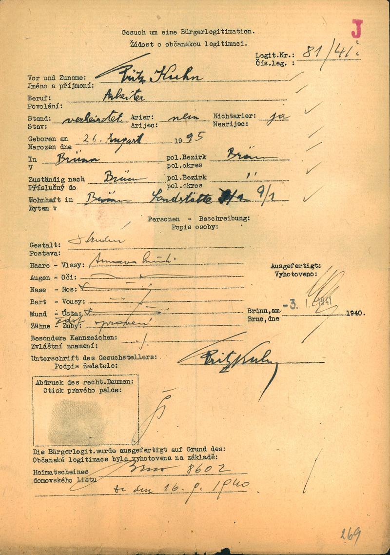 Moravský zemský archiv Brno > Policejní ředitelství Brno > Dodatky > Žádosti židovských občanů určených k transportu o občanské legitimace > Kuhn Bedřich
