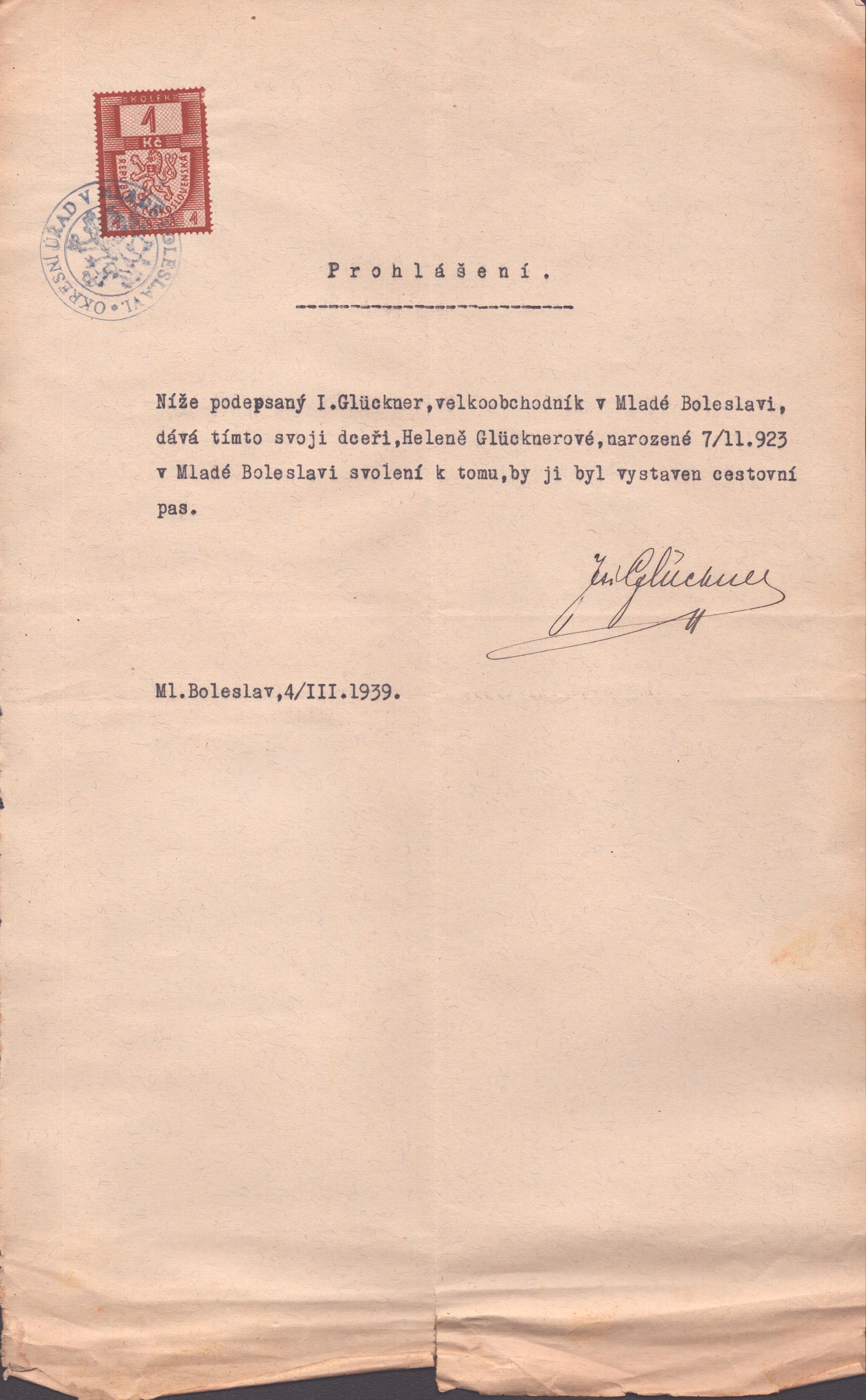 Glücknerová Helena: Svolení otce k vydání cestovního pasu