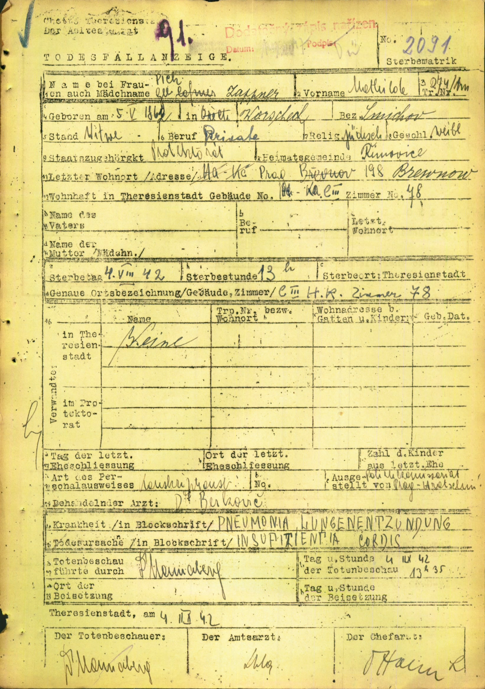 Picková Matylda: Todesfallanzeige, Ghetto Theresienstadt