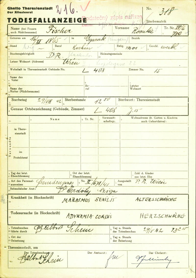 Fischer Rosalie: Oznámení o úmrtí, ghetto Terezín