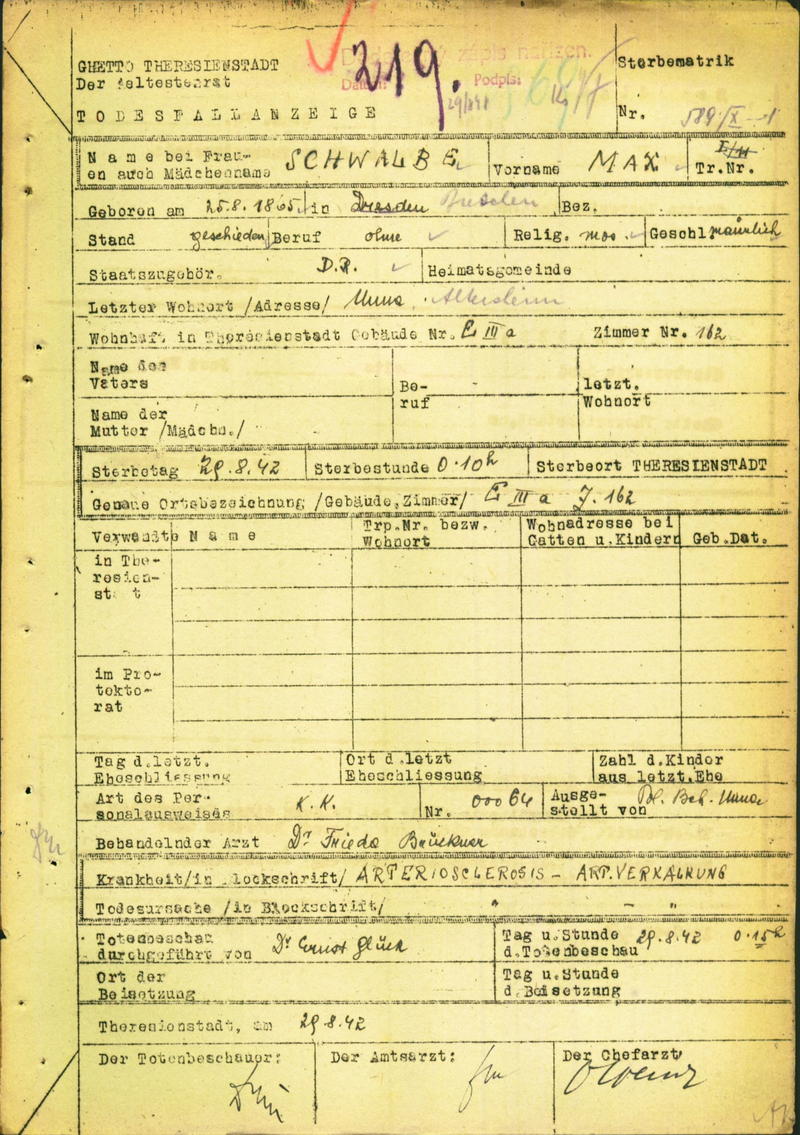 Schwalbe Max: Oznámení o úmrtí, ghetto Terezín