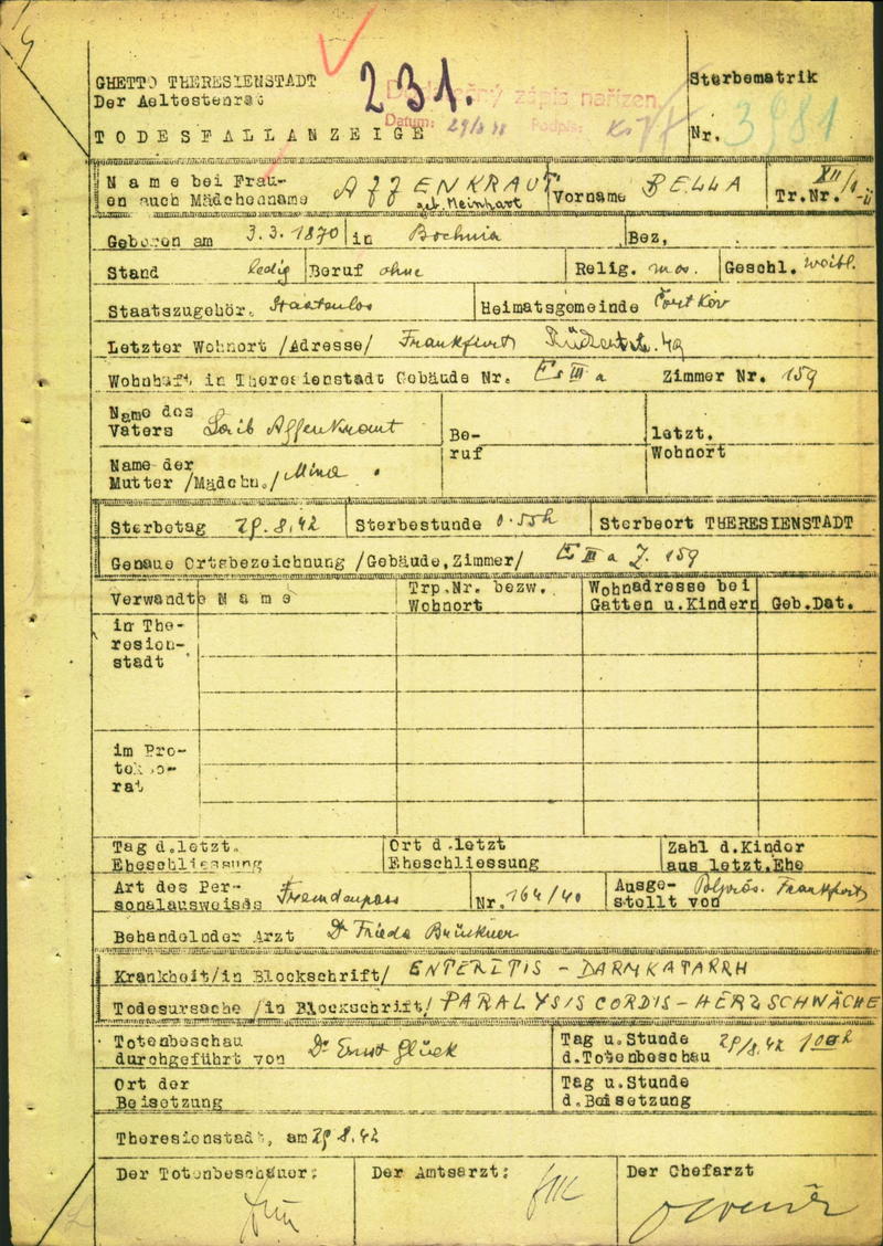 Affenkraut Bella: Oznámení o úmrtí, ghetto Terezín