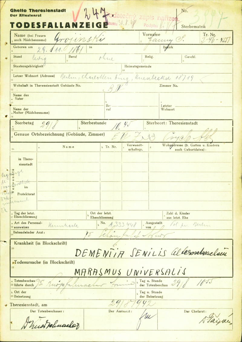 Groschinsky Fanny: Oznámení o úmrtí, ghetto Terezín