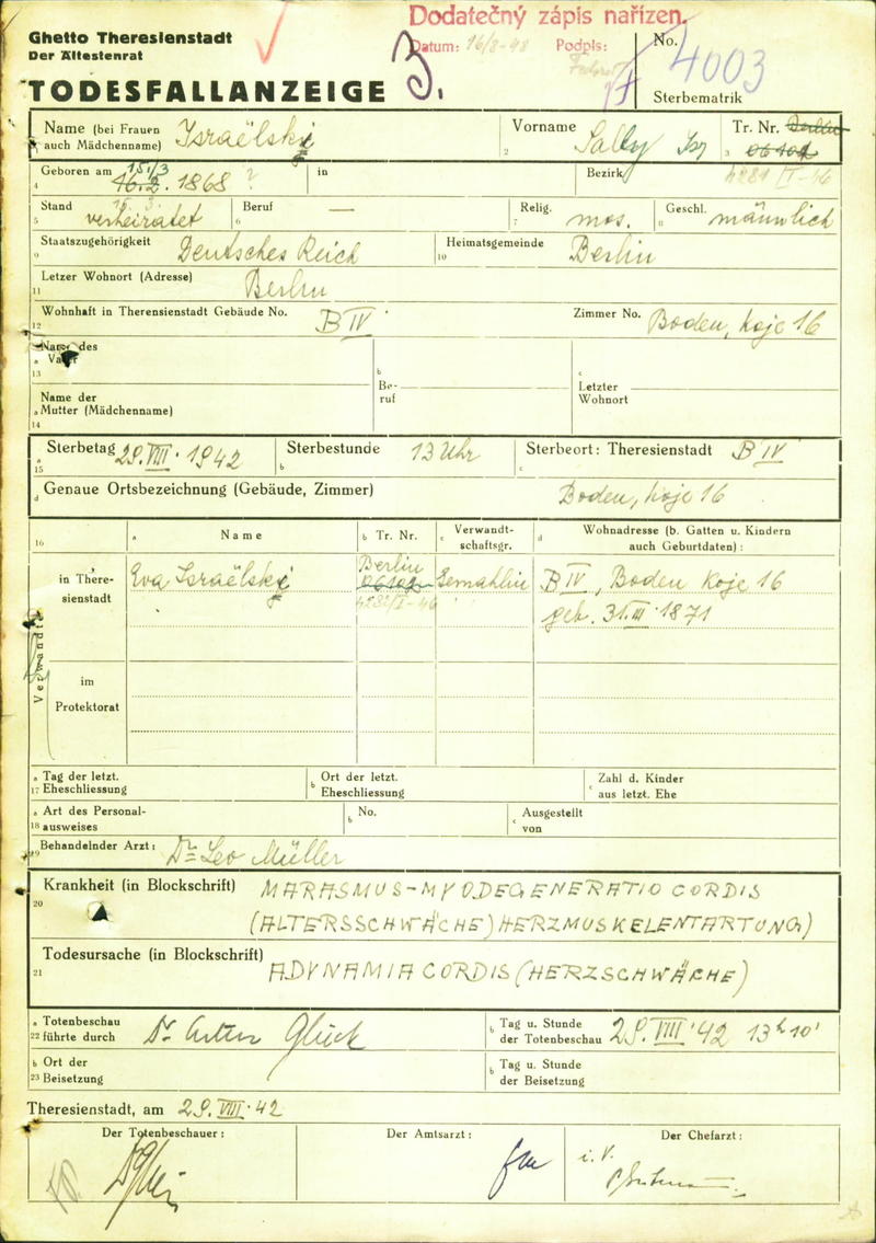 Israelski Sally: Oznámení o úmrtí, ghetto Terezín