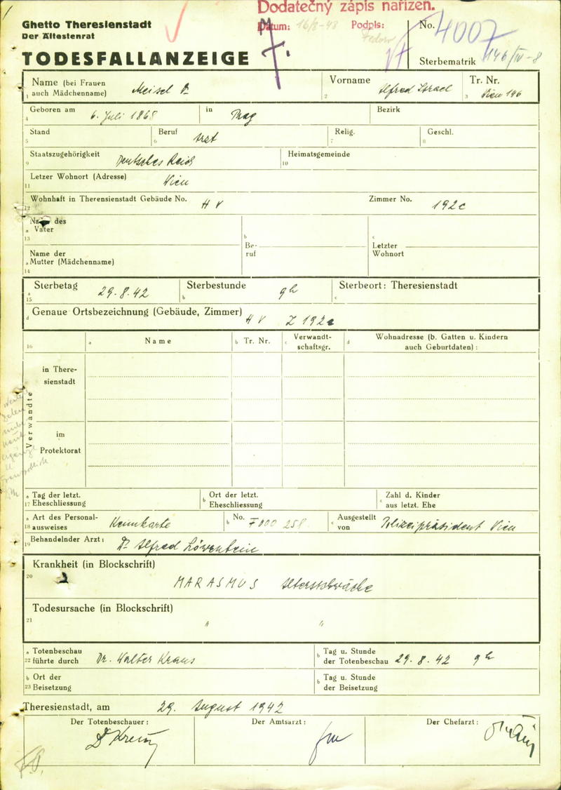 Meisel Alfred: Oznámení o úmrtí, ghetto Terezín