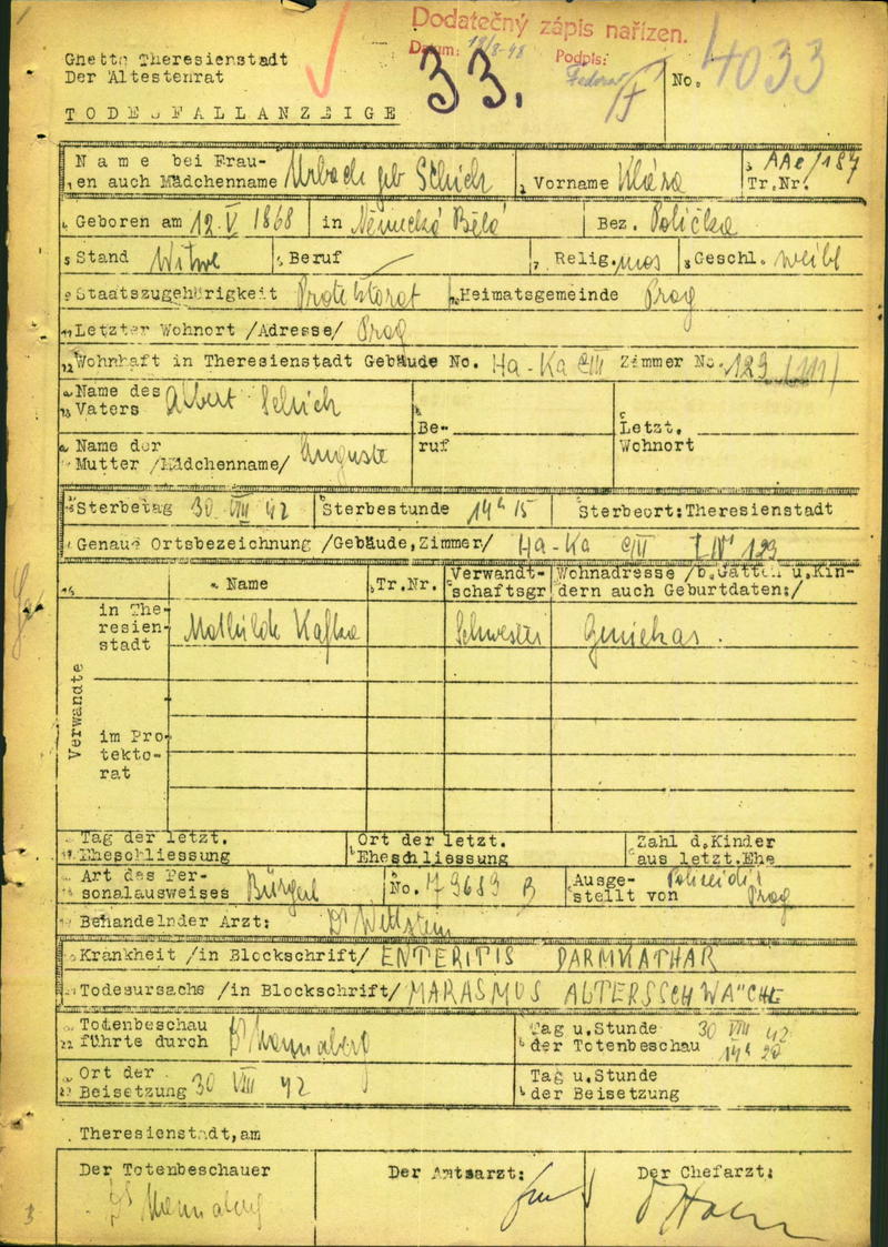 Urbachová Klára: Oznámení o úmrtí, ghetto Terezín